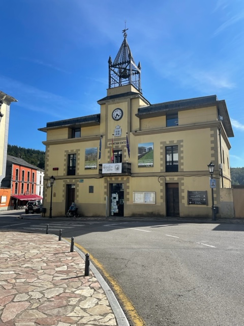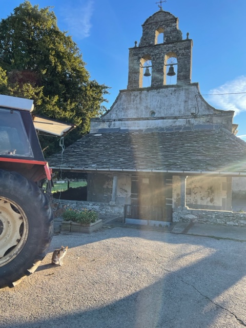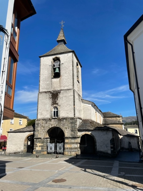 Really cool church, giant, actually, at the center of this wonderful little town. Iglesia de San Salvador de Grandas, directly related to the Primitivo Santiago Way. A temple is mentioned in 1186, then it was completely remodeled and extended during the 17th, 18th, and 19th centuries. However, the front door, gargoyles and the font are from the original building.