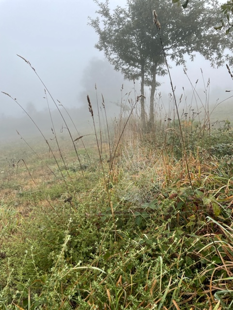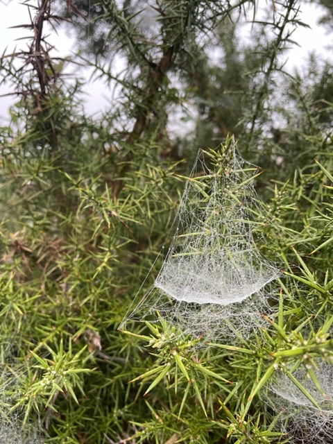 The morning was gorgeous, but the ornaments were the perfect spider webs (sorry, Kaziah). They shimmered in the light, some perfectly speckled with the mist and the ones like below were distinctly different, clearly a pocket.