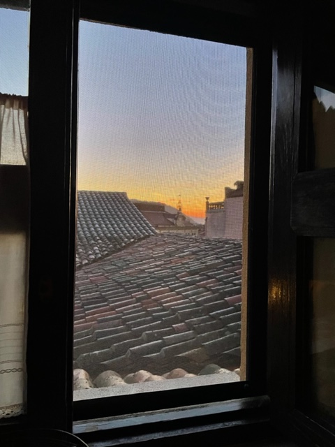 A few photos from my place last night, sunrise coming up, wishing I was out there, but I wouldn’t be able to see it on the hike because of the trees, so happy to see it here. And the screen was great because there were a fair number of flies. Then below that is the courtyard and the exterior of the castle. I was in the castle, not an addition as I’d thought, just hadn’t even looked at from the side where I go in. Sometimes, something like that pops up that makes me realize I’m not firing all cylinders. I’ll get stronger in the next day or two!