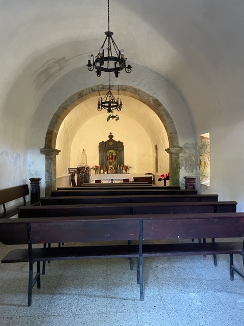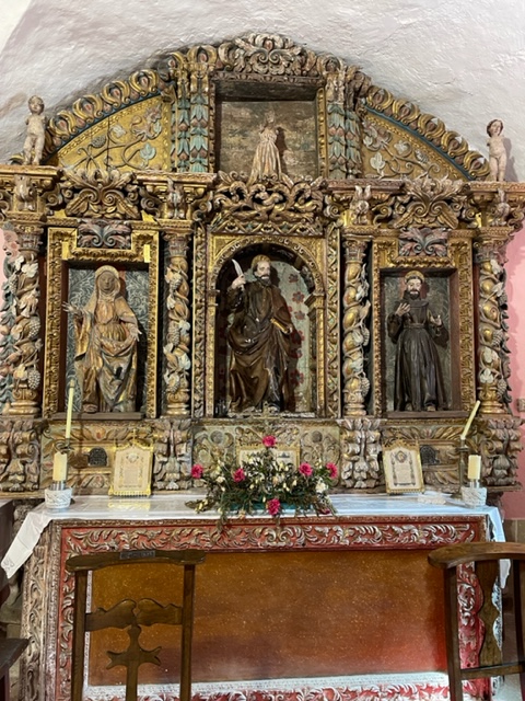 Tableau (don’t know the religious term for it) from the 16th century, it was to the right of the chapel shown below. I went in and put a donation in the box. A guy came out who was checking on things and I told him I’d put 5E in, but the paper might block more coins since they’d asked for 1E. He fixed it and was so nice – do you need a restroom? Water? I should have said yes just to see what was around the corner. But he had me come up and past the dividing line so he could show me the above art. Saint Bartholomew in the middle, Saint Francis on the right and Saint Ann on the left, made in the 16th century and all out of wood. I then got lost on the rest of what he was telling me, but he was so proud and delighted that I was interested. Sweet moment