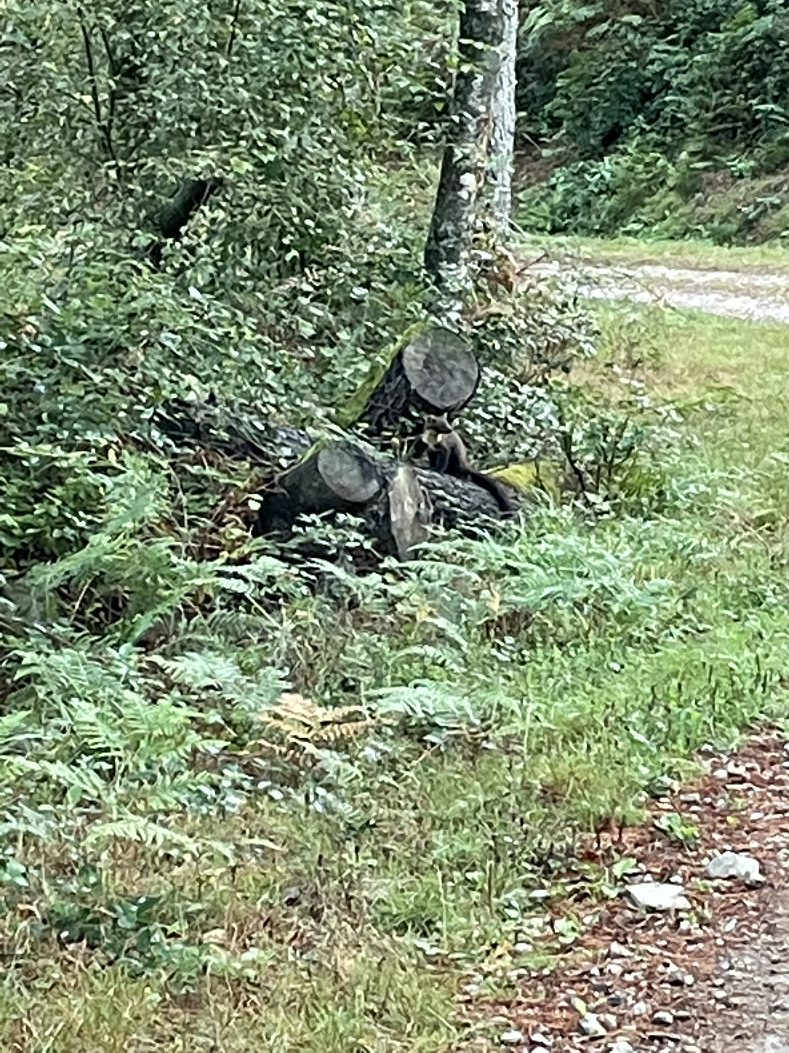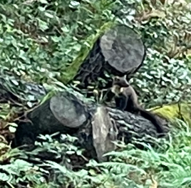 Per my Wise Pilgrim app, I took a Complementario route twice, adding another kilometer to the walk, but the two paths were a gift. The Galician government added an official Camino route, and left the original one – calling it the Camino Complementario route. Have no idea why and it certainly did a number on the few areas that lost the main Camino. But for me – the first choice of trail, every other person went on the main one, partly because it was slightly shorter. So suddenly, I was all alone, it was quiet, the cows were sleeping and it was a good bit further away so I lost any traffic sounds. Just birds. It was amazing. AND because no one else was walking, I saw animals. It’s a bit blurry because I was trying to telephoto – but there’s a weasel on the log above. At least 2’ long from snout to end of the tail and it seemed to feel pretty safe. It just watched me as I took a few steps, then a few more, trying to get closer. Later I saw two very small deer – don’t know what kind – leaping across a field.