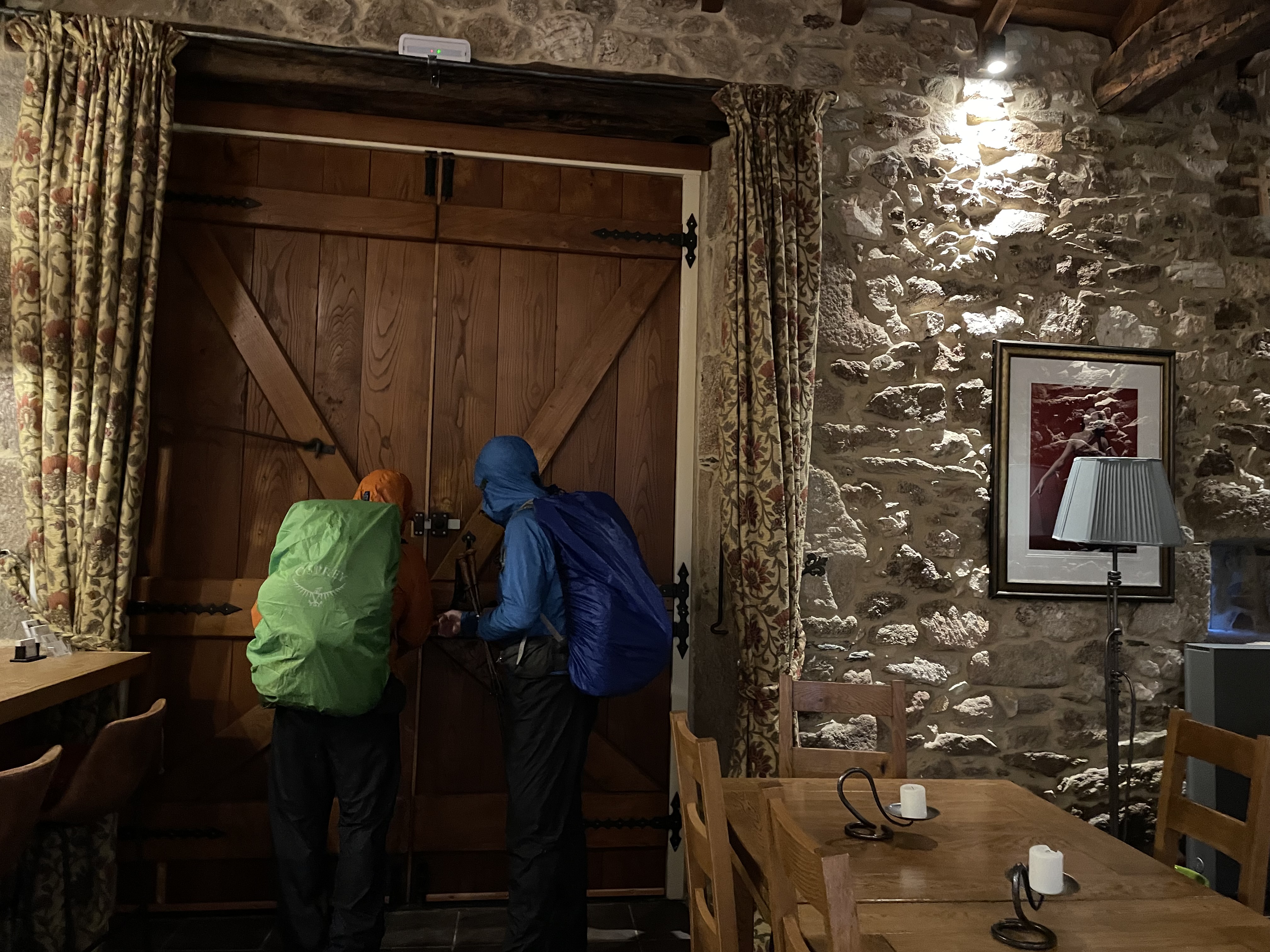 I was SO wet when I got to the hotel. Startled, per usual, to walk into town suddenly. I went to my room, radiators not working yet – nowhere – how am I going to dry anything? Then I heard all around me people in their rooms chatting through the windows onto this central covered space, I looked out and they’d all popped out these hanging racks and were putting their things out. Cool! I took the photo without the guy across from me because he’d already taken everything off at least on top and I didn’t want to take a chance of looking too closely. They were all hilarious chatting. The woman next to me told me we were neighbors now hanging our things out to dry – couldn’t tell you what else she said, this is all I got.
