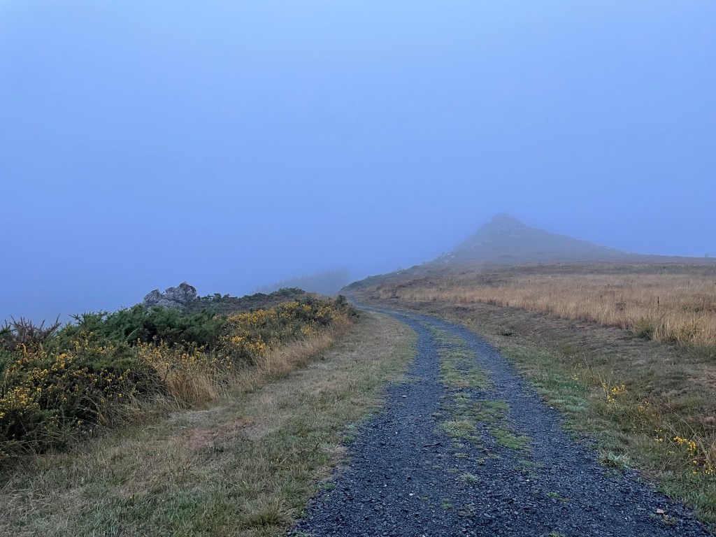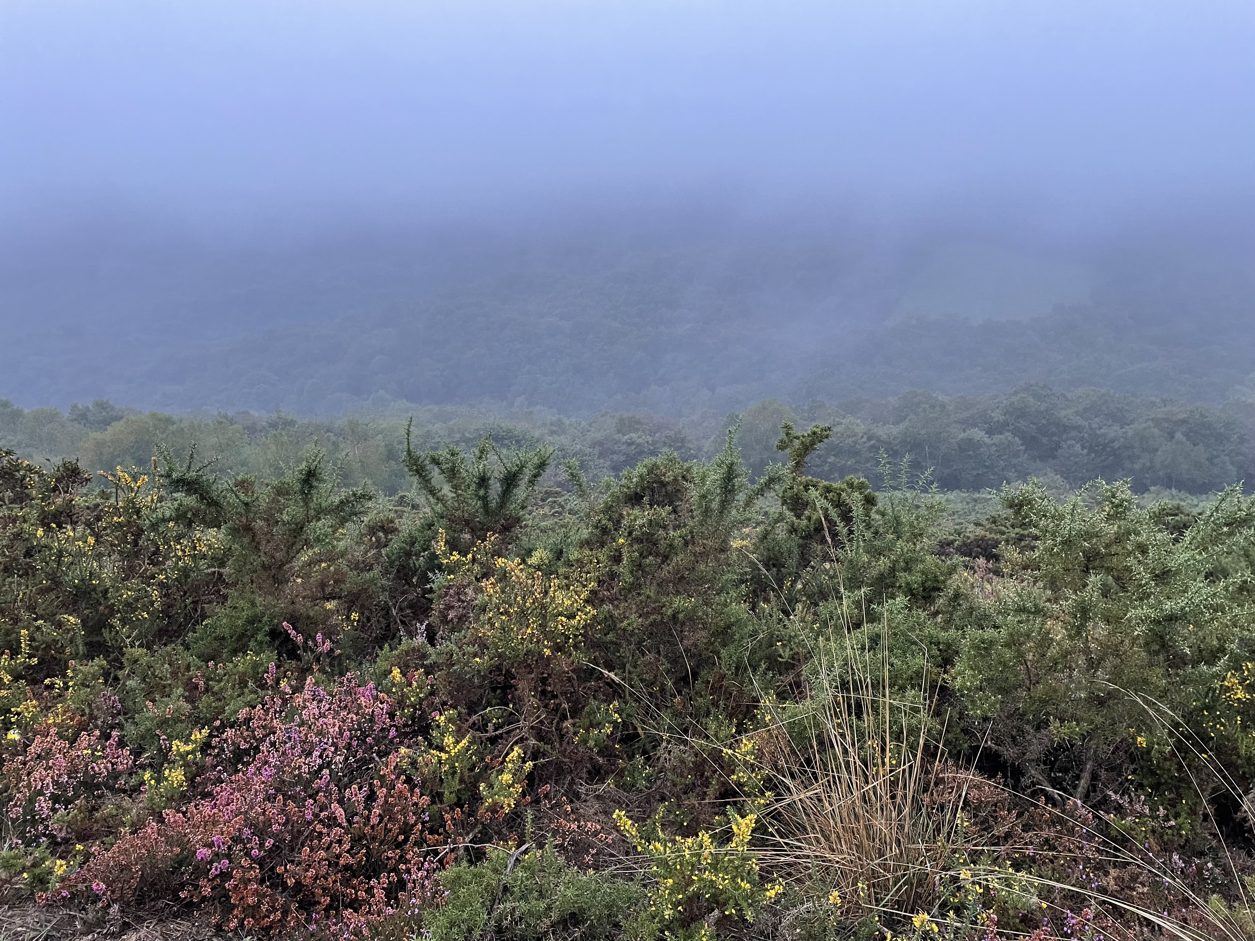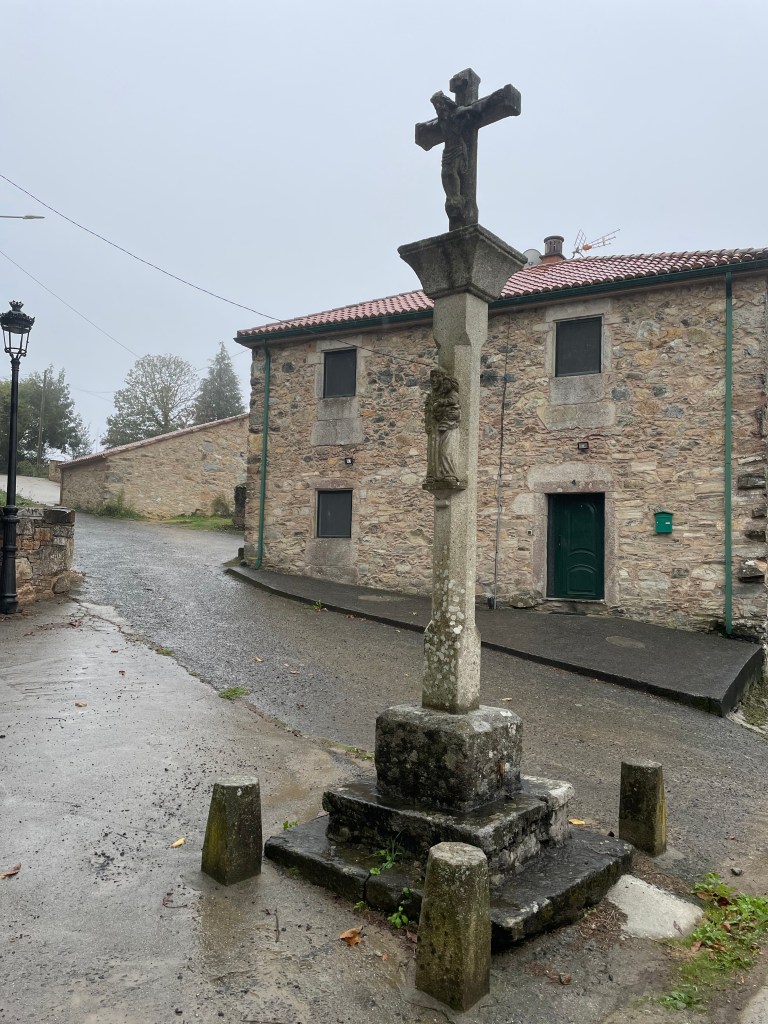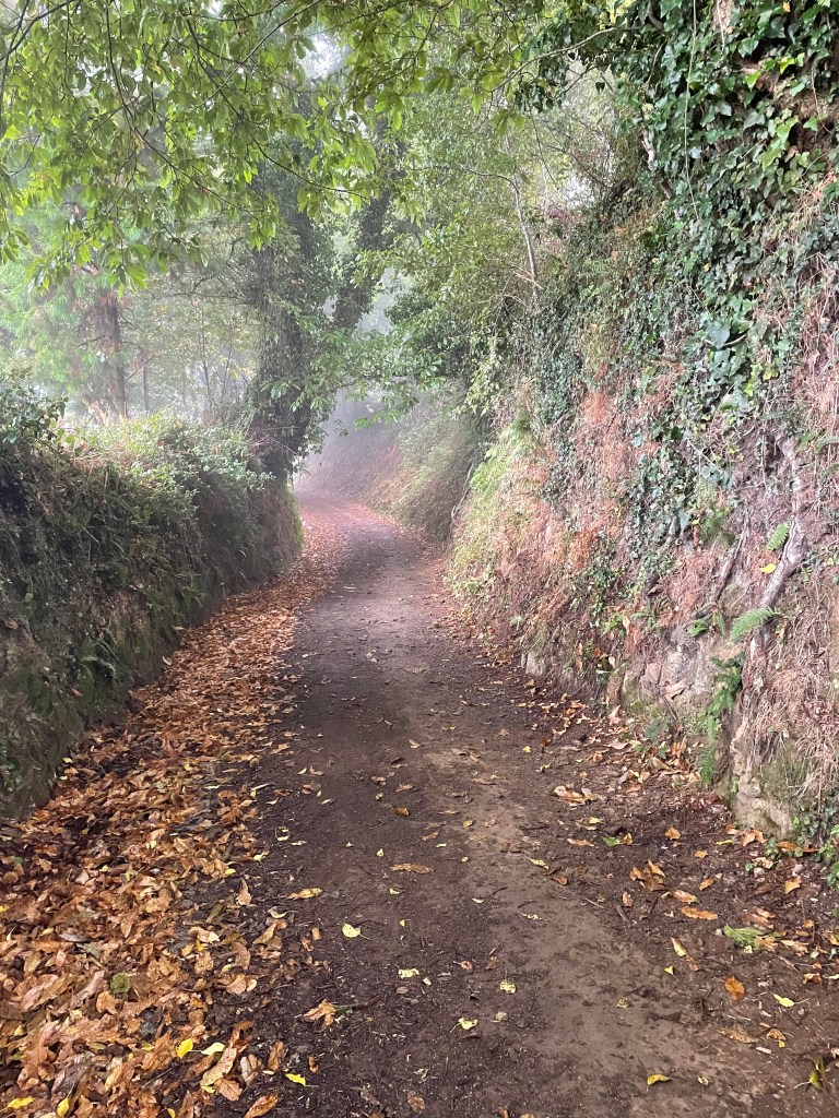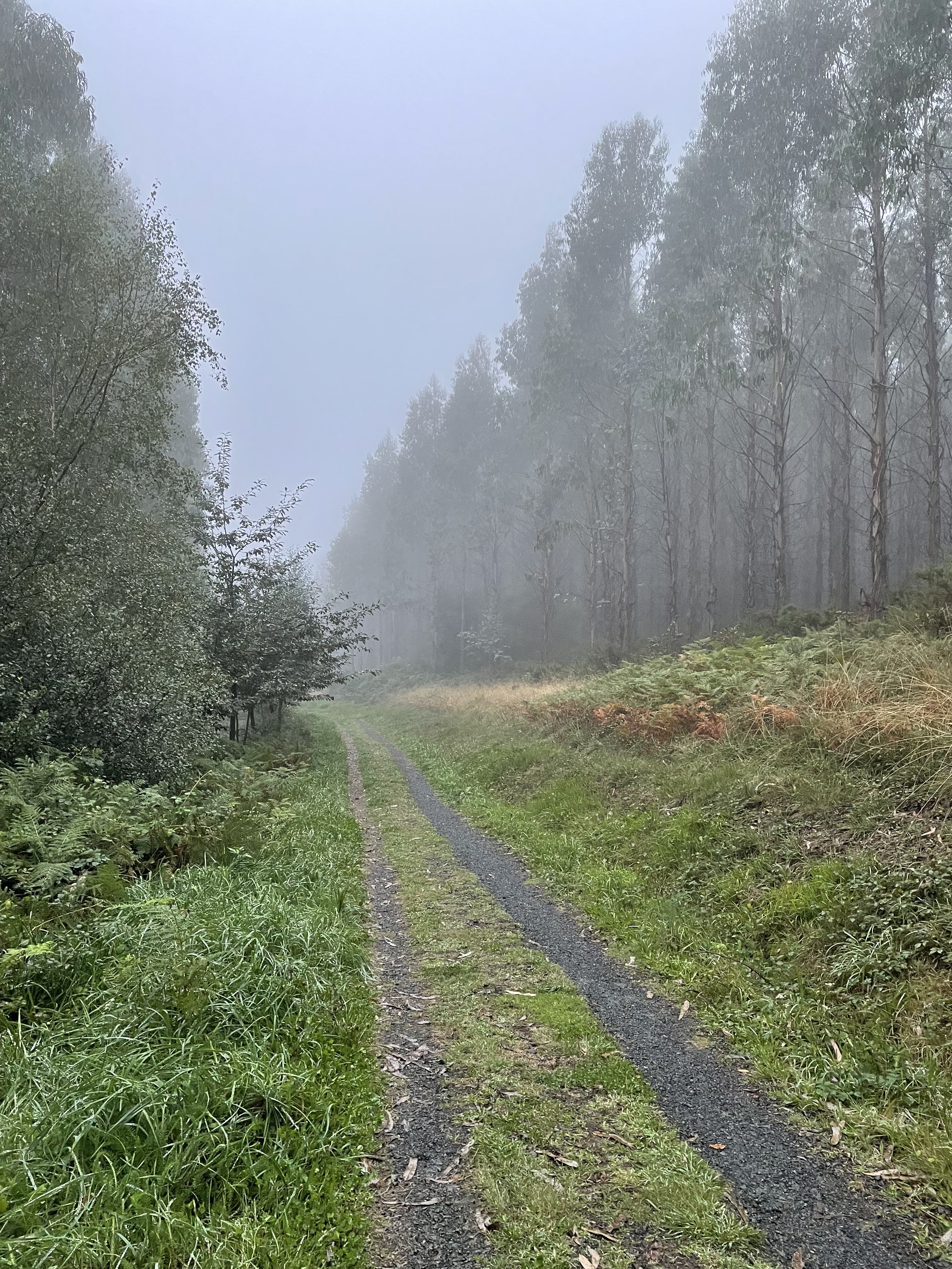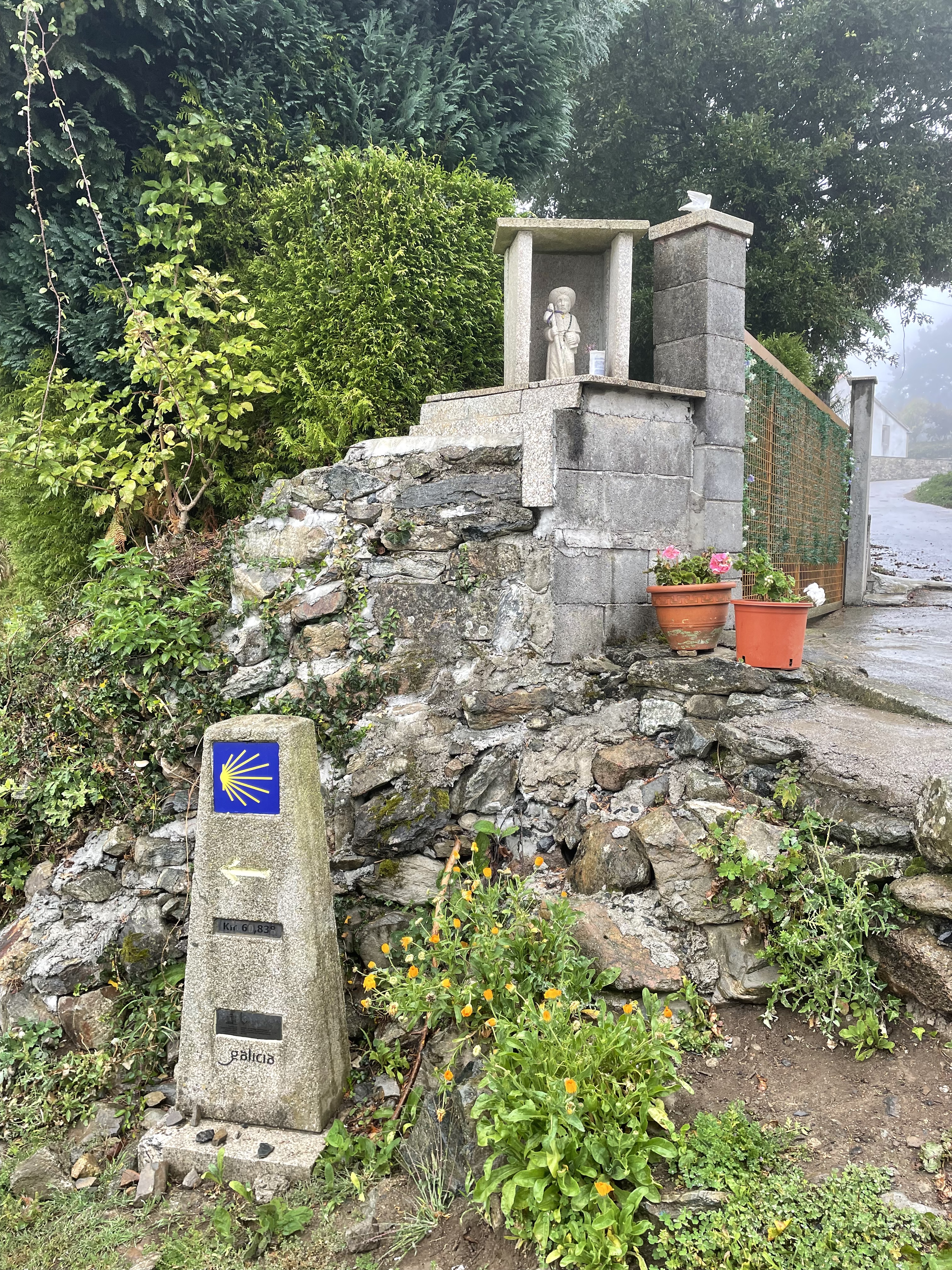 And this is today. I had one of those giddy happy moments here, just me and the mist/rain. Actually, once it started to rain, it didn’t stop for the rest of the day, but at this point, I loved it. The day started with some confusion on my part. I’d been picked up yesterday and the notes from Camino Ways, who organized everything, said they’d take me back down in the morning. But as I got ready to go, 2 other guys were leaving and the owner said – oh yes, just walk out that door over there. What? Well, turns out that the road we came up was the Camino and I hadn’t realized because I’d so enjoyed looking at the view and listening to the girls and their dad talk in German. Hmm, so do I worry that I missed 3.9 miles of the Camino? Not enough to go down and then back up. Plus I walked a ton in Lugo, that covers just the mileage, so off I went on my happy way. The advantage was that since we were 3.9 miles outside of Ferreira, no one else was walking here on the Camino yet and the two guys ahead of me walked much faster. Thus, the quiet.