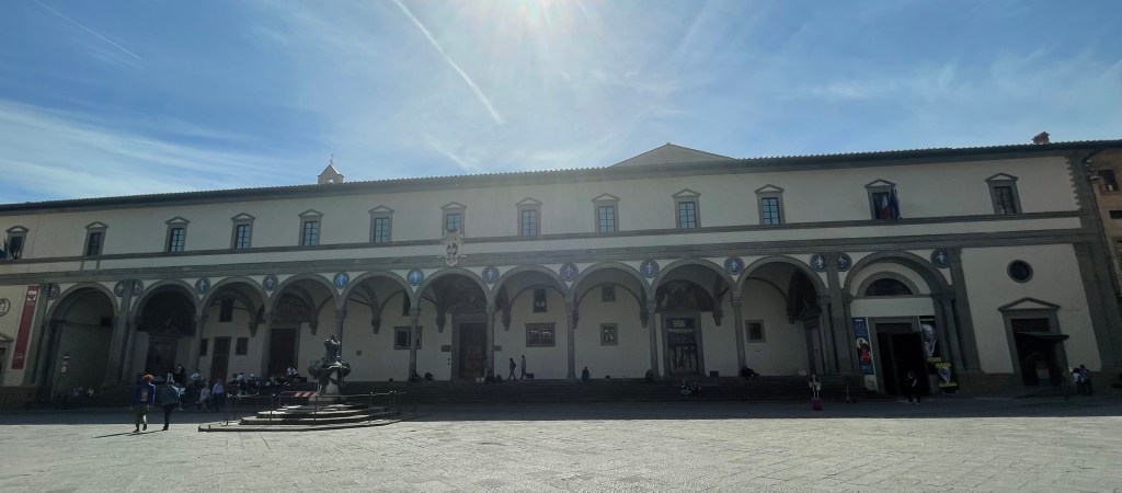 Piazza della Santissima Annunziata, the start of the renaissance happened here (according to Chiara). This was the first building that Brunelleschi designed and he was making a statement – that the windows and shapes reflected the shape of a person’s head and shoulders, thus the arch. No longer the steep shapes that pointed to heaven and were meant to remind humans how small they were in comparison to God. This the Hospital of the Innocents for orphans. Brunelleschi said that he wanted to give beauty to the orphans to try to make up for how hard their lives were. There’s a famous wheel that is still visible where it was possible to abandon newborns anonymously by making them enter a cavity that was opened by turning the wooden wheel.
