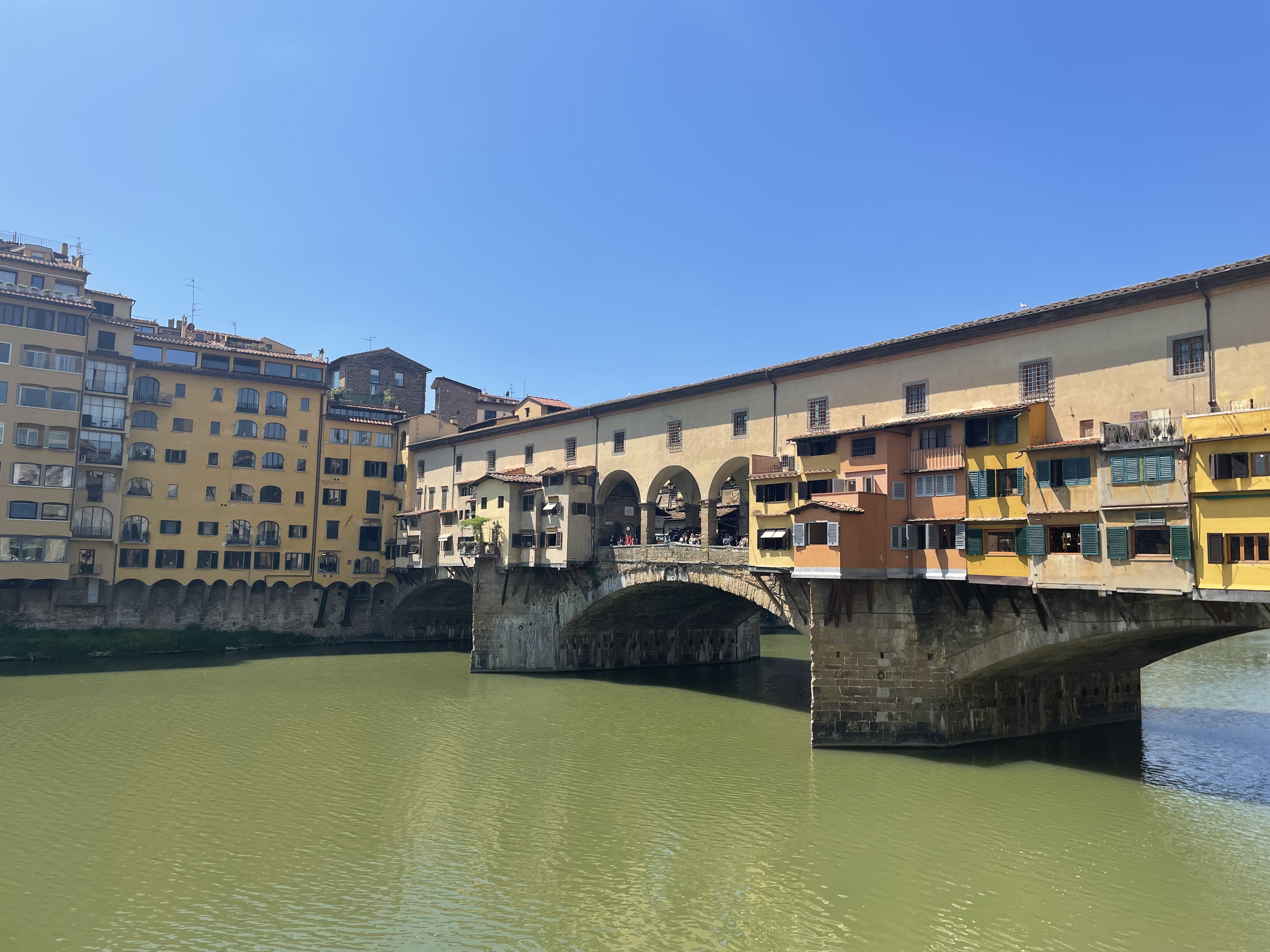 Ponte Vecchio – pictures of us on the only surviving bridge over the Arno River after WWII. The reason it survived is because the Italian general directing the strikes (to keep the allies from moving their weapons and troops through town) had gone through the upper corridor that connects the Palazzo Vecchio (Florence’s town hall where Cosimo de Medici governed) with the Palazzo Pitti (where Cosimo lived) in 1565. The general had seen all of these portraits of Cosimo in the corridor and knew there was valuable history and that it shouldn’t be destroyed. Plus he knew that the bridge itself couldn’t hold the heavy allied vehicles. So he bombed the roads leading up to the bridge and all of the other bridges, but saved this one.