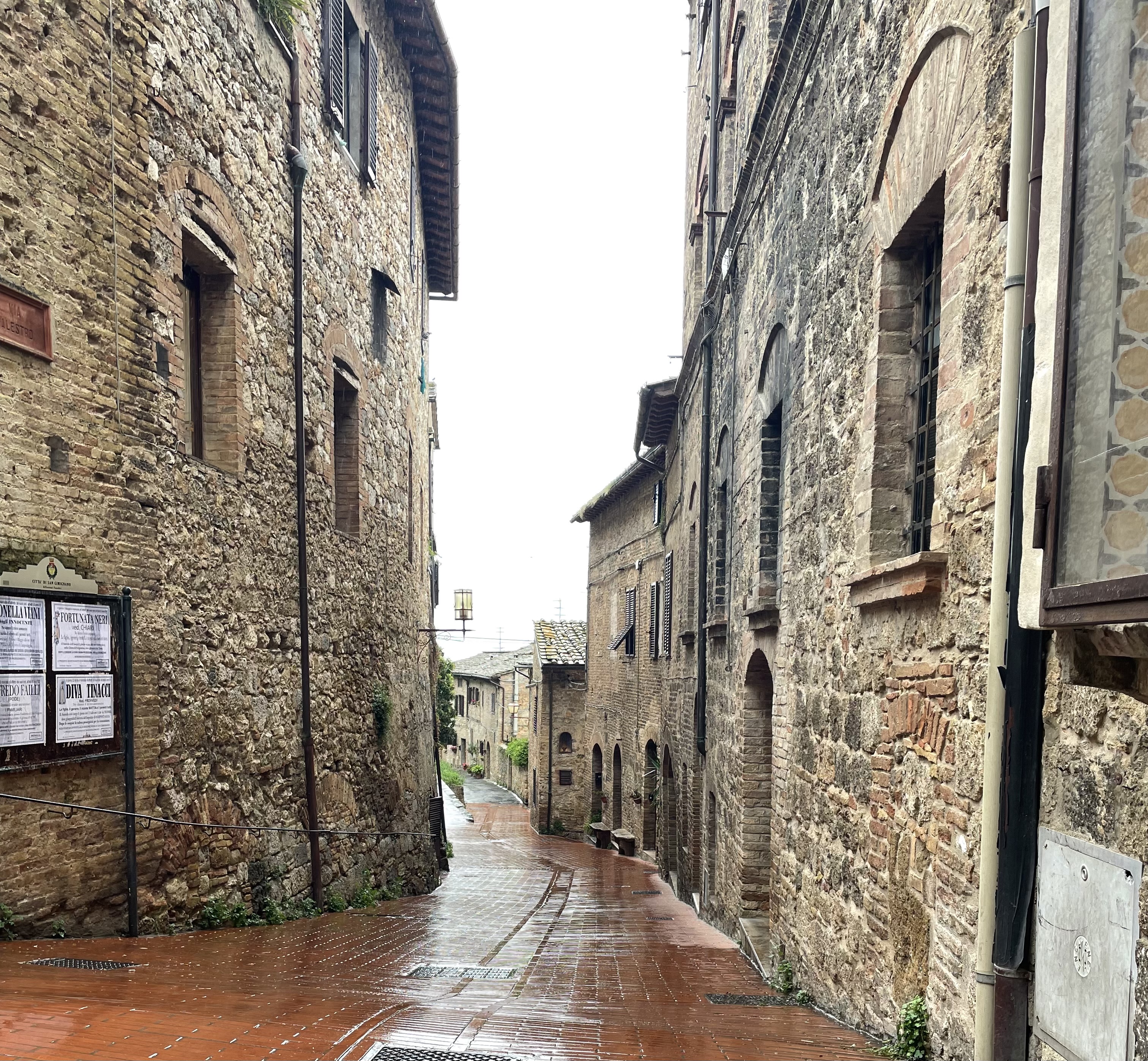 And then it was really pouring. Then hailing. Rick almost ruined his phone trying to figure out where we were going, it took all night to recover. The last 2 miles walking through Siena towards the old city were at least 5 miles long, we were definitely wearing out. But we got to our hotel right at 2:15 and they said if we could get down there in 5 minutes, they’d give us lunch. AND they’d taken our bags up to our rooms which was really nice because it was up several floors and no elevator. We had soup and salad and it was perfect. The soup was the one that Stanley Tucci showed his mom making in the Tuscany episode of his show. Seriously perfect for cold sopping people, albeit in dry clothes after a quick change.