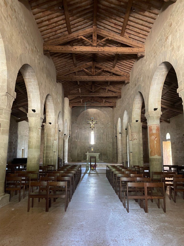 Our next interesting site was the Monastero di Bose a Cellole. The most wonderful monastery, still active (Rick looked through the door after they called for prayers and saw 4 monks and 2 visitors in the service). It is a 12th century Romanesque church, austere, quiet and wonderful. They take guests for retreat and Rick was ready to sign up.