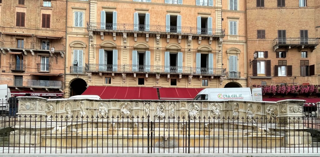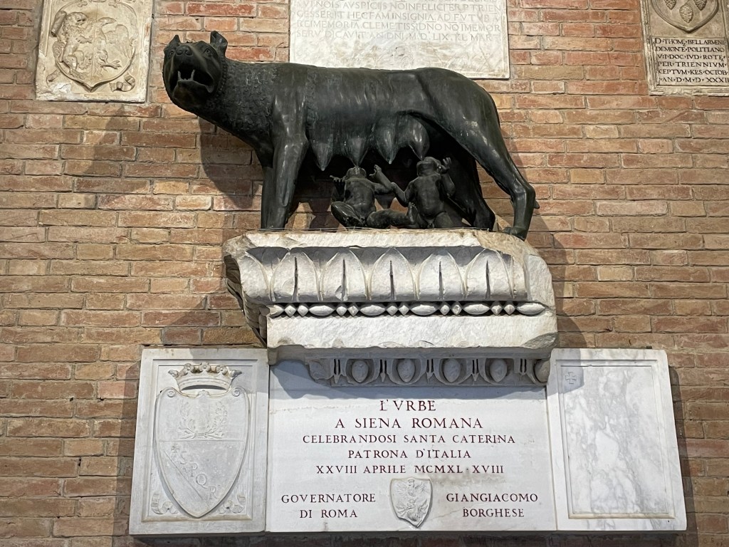 The image below was everywhere, often on top of high columns and we couldn’t figure out what it was about. Turns out the she-wolf is the image for both Sienna and Rome. Rome was named for Remus and Romulus, brothers who were abandoned and nurtured by a she-wolf and who later founded Rome. Then one of them had a son, Siena, who traveled up from Rome and founded Siena.