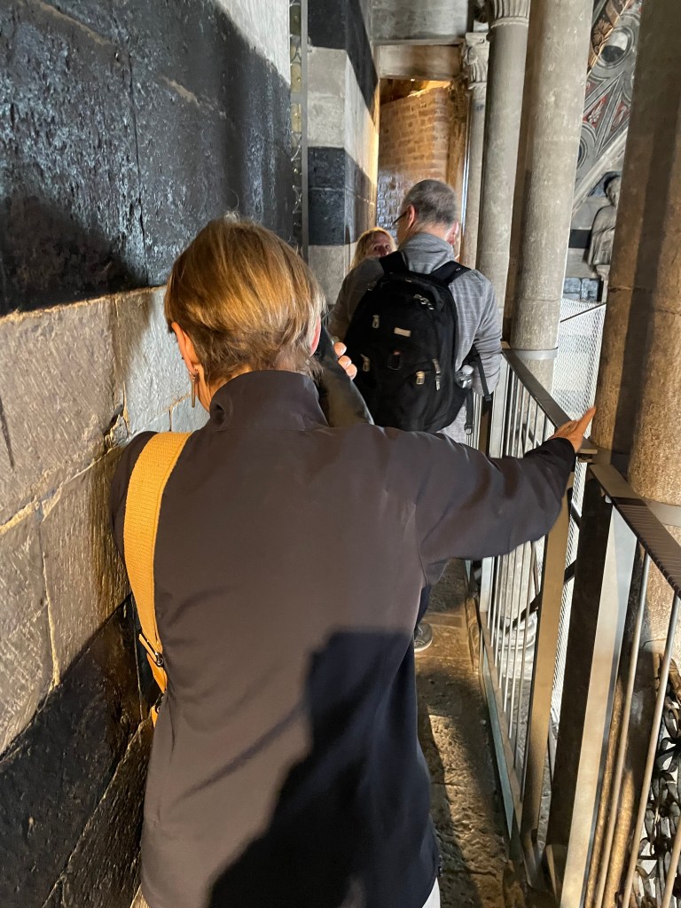We learned a ton, courtesy of Rick Steves. We started with the roof tour of the cathedral, though Rick had to take some of the photos. Looking down into the cathedral and close to the vaulted ceiling and over the town. How in the world did they do this in the 1200’s – 1300’s? Just boggles the mind. So lucky to see it early before most people were out and about. And this is just the front, it’s incredible all the way around. The bottom half of the duomo was built in the 1200’s. 22 of the 23 kinds marble came from Tuscany, 1 from France. Incredible.