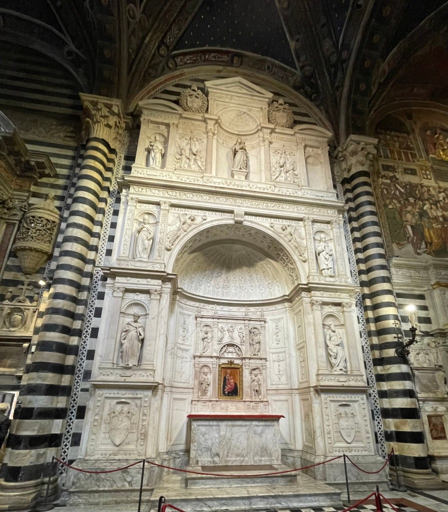 The Piccolini altar design was all supposed to be by Michelangelo. He did the figure of St. Paul on the lower right, but then got “distracted” by working on The David and others did the rest. The figure of St. Paul is amazing.