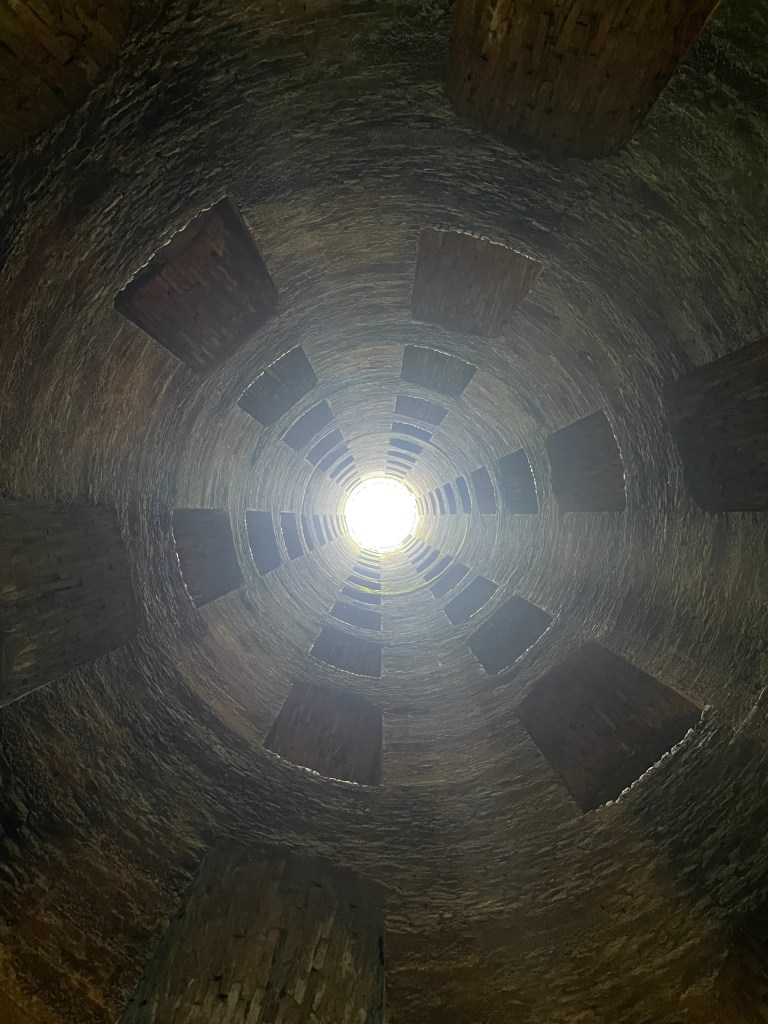 The first thing we did was to go down the Well of St. Patrick. Amazing construction of two spiral staircases circling the well. We didn’t read the initial sign too carefully and were curious about the width and shallow depth of the 248 steps down and 249 steps back up and admired the 70 arched windows. Turns out the stairs were designed with windows all the way down for light and with that stair scale so that mules could go down one side and back up the other bringing up bags of water for the towns people. I’m guessing it was hard on the mules, but it was a beautiful design. The Well of St. Patrick was dug at the behest of Pope Clement VII, who had taken refuge in Orvieto during the Sack of Rome in 1527 and designed by Florentine Antonio da Sangallo the Younger.