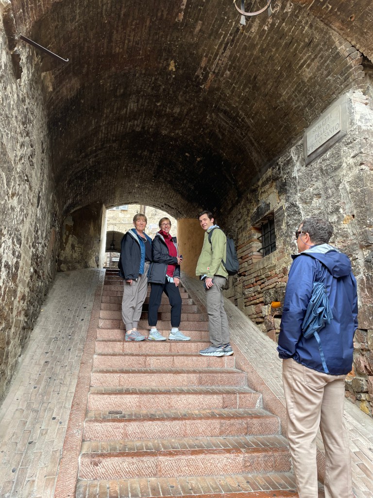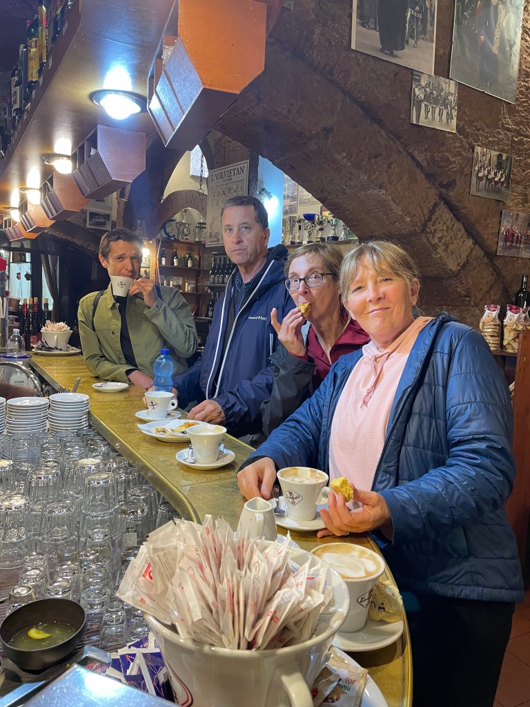 We then explored an archeological museum with treasures found in Etruscan tombs. The objects were amazing, made from ceramic, gold, glass, bronze and iron. Primarily from 5th to 3rd centuries BC. Cathy and I were fascinated and spent a long time exploring. Leaf and Sharon fully hit jet lag and Sharon curled up on a bench to sleep a bit while listening to us in the other room – we were the only ones in the museum. They couldn’t believe how long we took and that we had to discuss every single display case. Funny – but they’re right, we took a LONG time. I’d read about the Etruscan finds a number of times, so loved finally getting to see some of the remarkable art. Rick was on a phone call so missed it all. And I didn’t take a single photo!