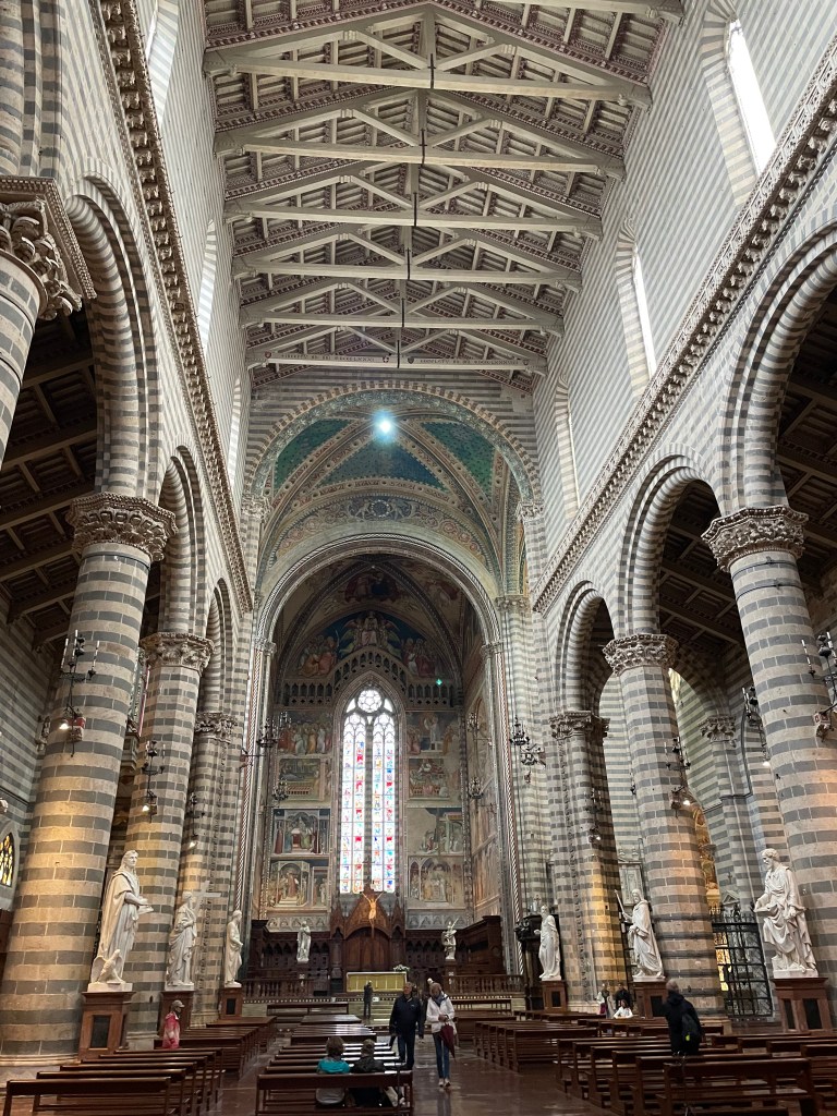 The outside was beautiful, striking and different because of the vividness of the mosaics against the stone. It was started in 1270 and additions continued up until the 1600’s, with the front facade primarily from the 1300’s. Incredible that they’re still so gorgeous. In addition, in the 60’ s Emilio Greco created the bronze doors for the cathedral. The aesthetics were not in dispute, but a national controversy broke out about the church’s historical cycle and when should the cycle be complete for the cathedral. The doors were finally hung in 1970. I thought they were beautiful and in keeping with the cathedral. They now have an exhibit of Greco in the museum next to the duomo. The artist donated statues with statues to Orvieto in recognition of their commitment to him and his art.