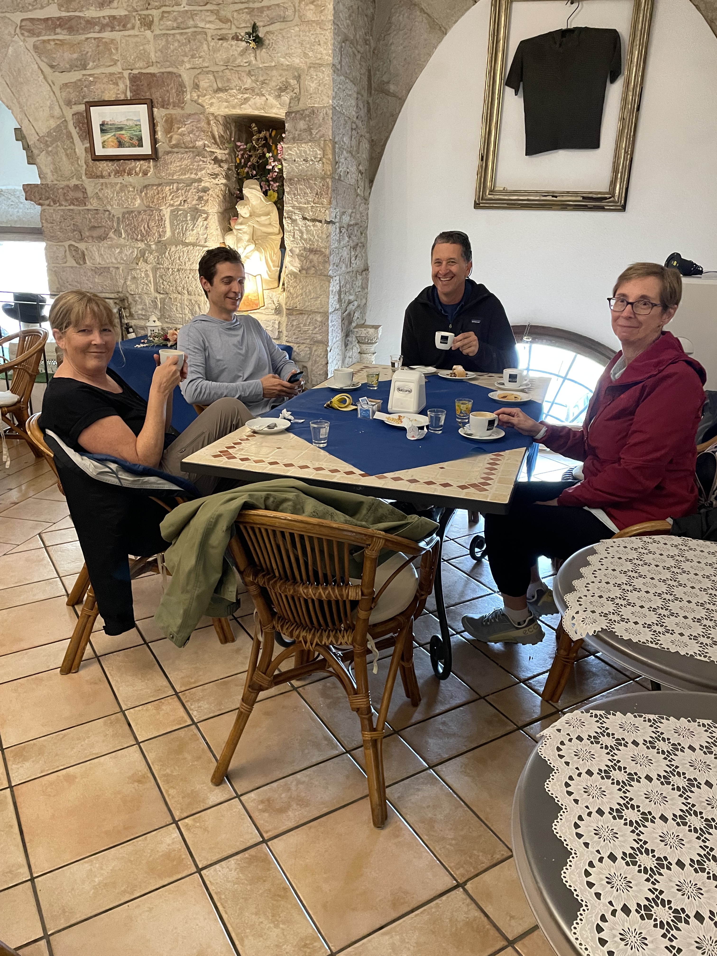 Leaf ended up winding through Perugia tracking and retracking to get us back on the way and then driving all through the medieval town of Assisi. We were scraping by walls and tourists alike with mere inches to spare with Sharon hyperventilating with the precariousnesses of the hills and driving. All of us were laughing so hard that by the time we parked, my sides hurt in ways I haven’t experienced in years. Leaf earned serious kudos from all of us. And parked right in the old city instead of one of the big parking lots. I didn’t get any photos because it was very hard to capture the situation, plus, like Sharon, there were times that both eyes and ears were covered. At one point, we circled the plaza in front of St. Claire’s cathedral which was NOT a driving area. Cathy was looking for any cameras that might capture the moment and trigger a ticket. We’ll all share the cost… Here’s a photo of Sharon beaming in pride at Leaf and Leaf recovering from the drama: