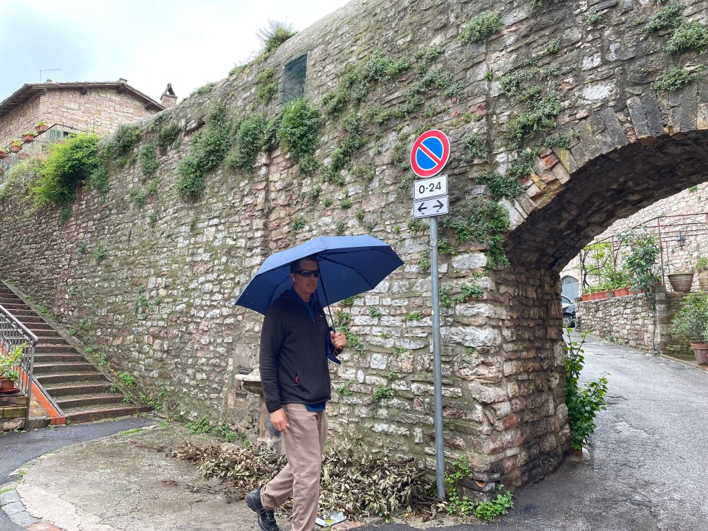Then we started walking Assisi. The first place of note was the aqueduct built by the Romans and that still brings water to Assisi. There was a fountain that still works and was the gathering place during Roman times for collecting water for the houses in the area. I think I was wearing out re photos because I’m missing a lot. The two above were taken by Sharon and this is the only one I got of the aqueduct and you can see the edge of the fountain behind Rick. Raining pretty steadily, though not hard.