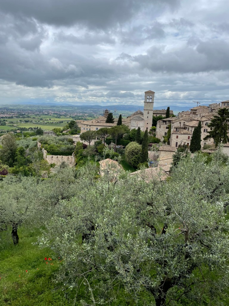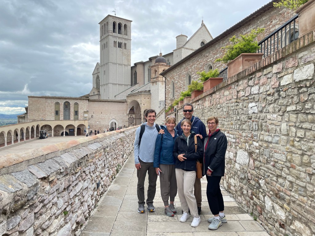 I loved today! Every day has been wonderful, but today was especially so because we spent the day in Assisi, home of St. Francis and Poor Clare – or St. Clare – Chiara in Italian. First, we drove to Perugia to get me signed on as a driver, but then very happily, Leaf kept driving. Because our first excitement of the day was confusion around GPS directions and finding parking near where we wanted to start our Rick Steves audio tour. Leaf drove, but he had a LOT of help from the peanut gallery who weren’t driving.