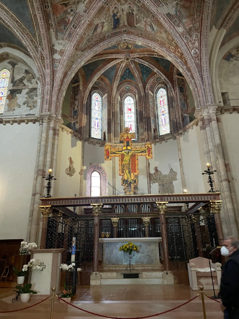 The cross below is the San Damiano Cross that St. Francis was praying before when he received the commission from the Lord to rebuild the Church. It now permanently resides here with a copy in San Damiano.