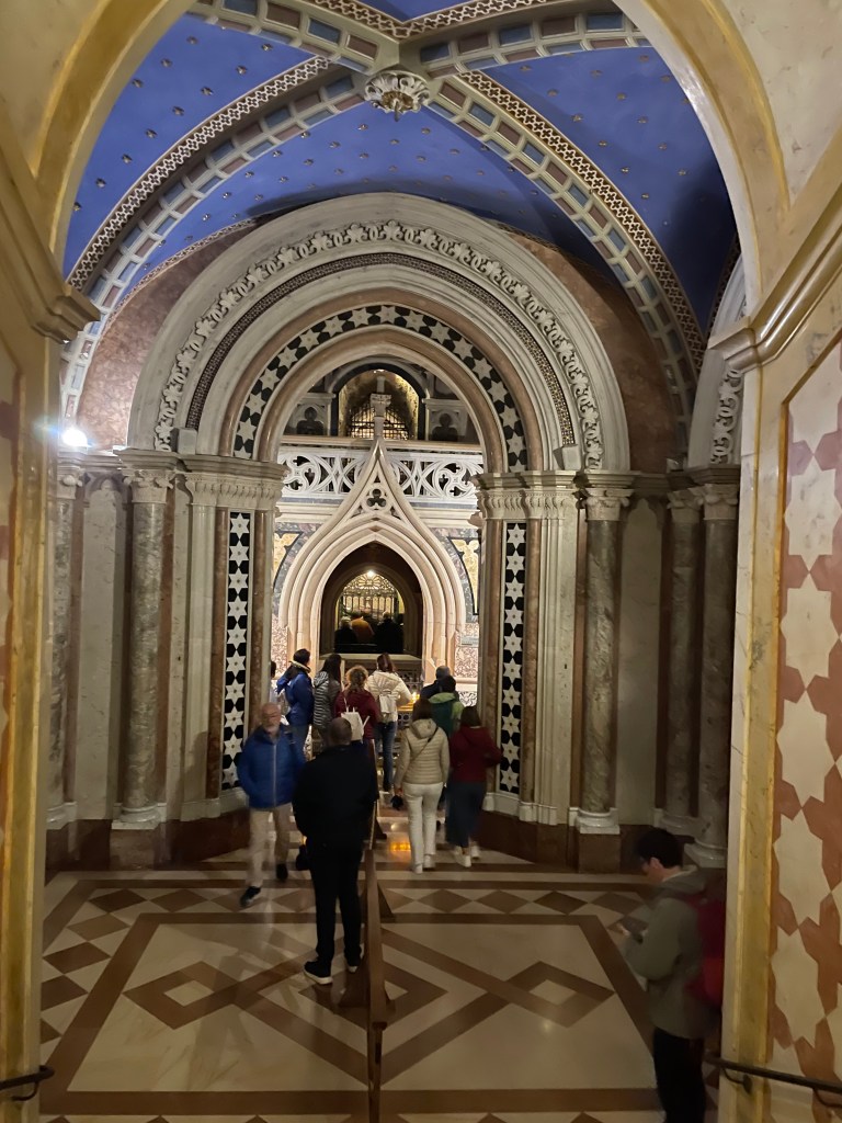 Having remained, like the body of St. Francis himself, hidden for six centuries, Clare’s tomb was found in 1850 after a prolonged search. On Sep 23 that year, the coffin was unearthed and opened. The flesh and clothing of the saint had been reduced to dust, but the skeleton was perfectly preserved. On Sep 29, 1872, the saint’s bones were transferred to a shrine in the crypt of the Basilica of Saint Clare. And this was a scene because of the fervor and devotion of people going down to the tomb, women falling to their knees, praying, crying. Not all, but it wasn’t rare. It felt too disrespectful to take photos any closer with those who were so moved, but this is the layered approach to the crypt.