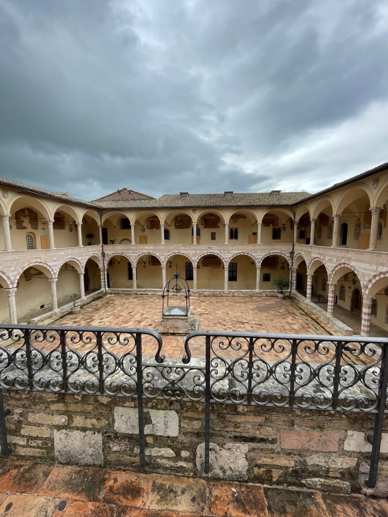 Here’s a story about the cloister that was posted in the church: The Cloister was a haven of peace. Clare, in September 1240, confronted the troops of the Saracens led by the emperor Frederick II of Germany, who entered the cloister. Clare ordered to be brought, infirm as she was, to the door facing the enemies, preceded by the small silver box in which the body of Christ was kept. The Saracens, struck by the force of her prayer, very quickly left the place of San Damiano. The city of Assisi continues to celebrate this liberating event of Clare with the “Festa del Voto” (Feast of the Promise), every year.