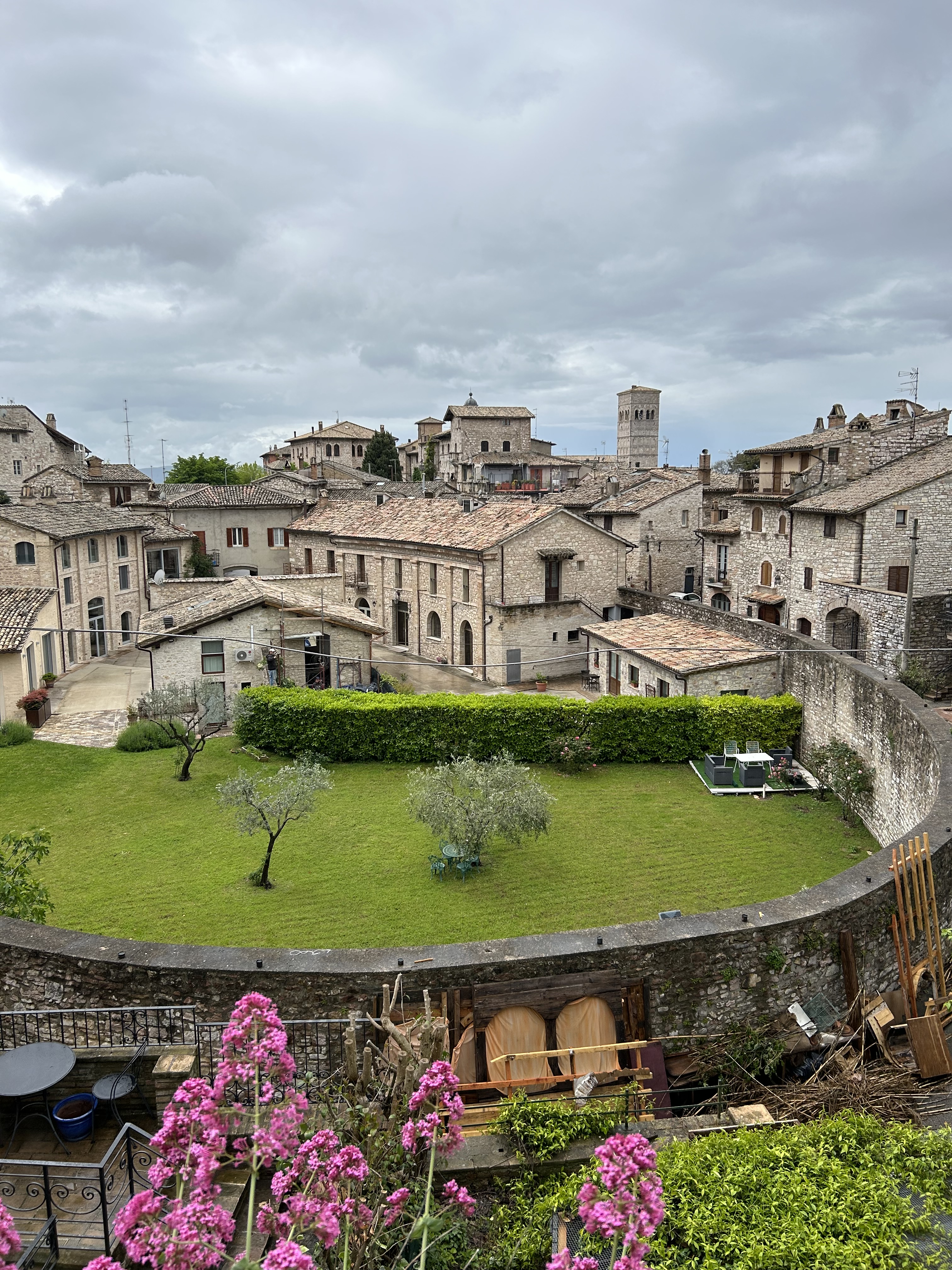 Once we gathered ourselves with coffee and pastry, we started off. In circles. We could not figure out the Rick Steve’s directions for the town tour, it actually was the least clear tour I’ve done and it’s probably my 5th or 6th to do? But we finally got traction. This is the Roman amphitheater, absorbed into a medieval circle of homes. The town gate was just a block away from which you could see out into Umbria – the “green heart of Italy”. It’s the only region that does not have a sea or other country boundary.