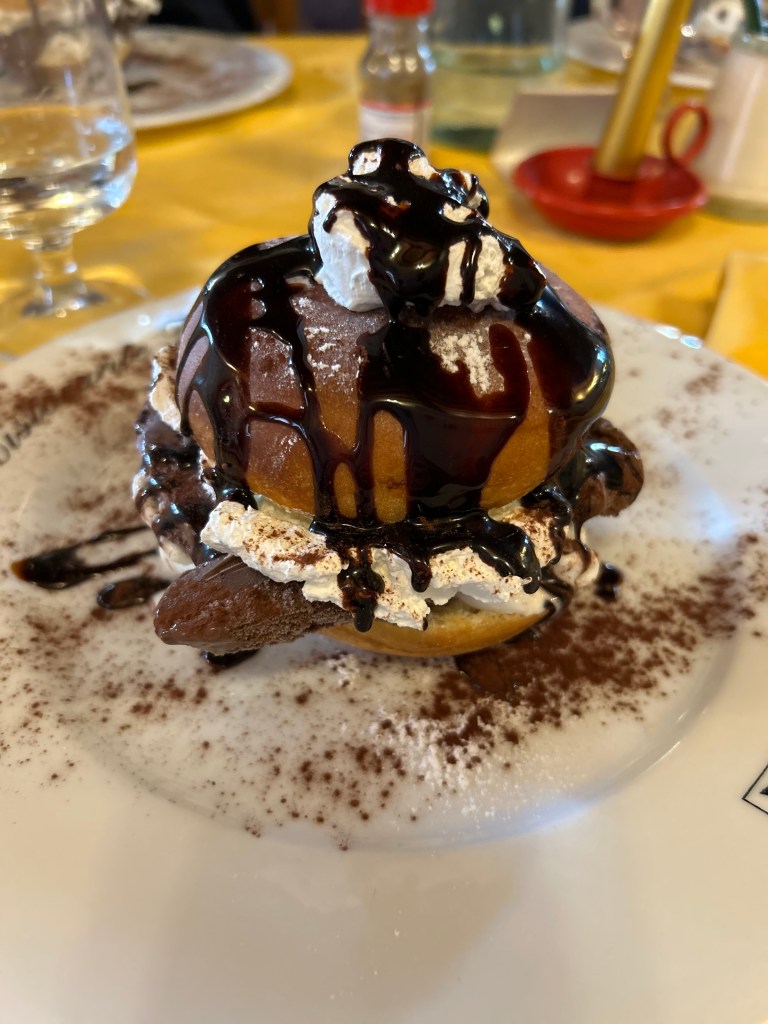 The owner took pride in telling us that his partner had earned multiple awards for her cooking and so she should have. It was a simple kitchen and she put out really interesting diverse foods. Here’s a photo of a desert we couldn’t resist, Rick and I each had one to ourselves, though neither of us could actually finish it. But boy was it delicious trying!