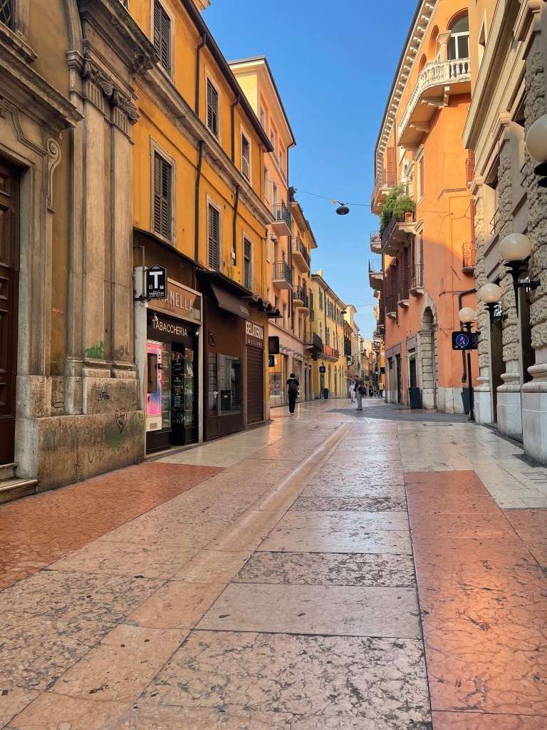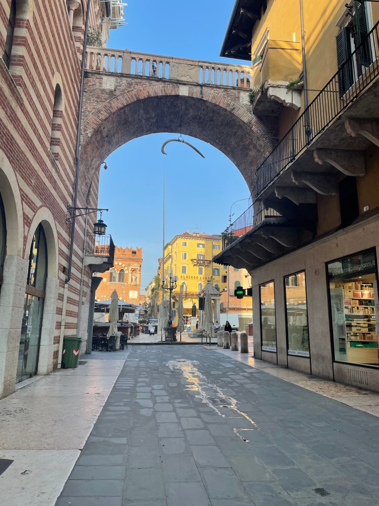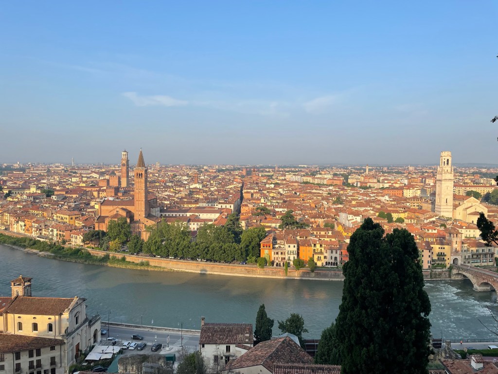 I took an early morning walk around Verona today, up the hill to see the view and back through town. It’s taken long enough to start to get a clear sense of how to move once in the streets where you can’t really see landmarks outside to orient. In this photo, the Duomo’s white tower looks the tallest, but the family of Della Scalia who built the medieval Castel on the distant left, made sure their tower was higher than the churches – thus the lack of the steeple. Government over church.