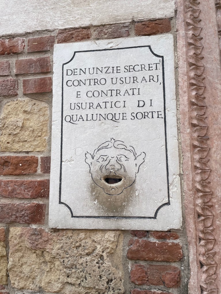 Citizens could voice their concerns anonymously by placing hand-written notes into designated boxes. In turn, the government would address each complaint individually. These boxes, or bocche di leone (lions’ mouths), were scattered throughout the city. Each stone receptacle resembled an intricately carved face, often that of a lion—the winged lion of St. Mark is the symbol of Venice —with a slot at the mouth into which letters could be inserted.