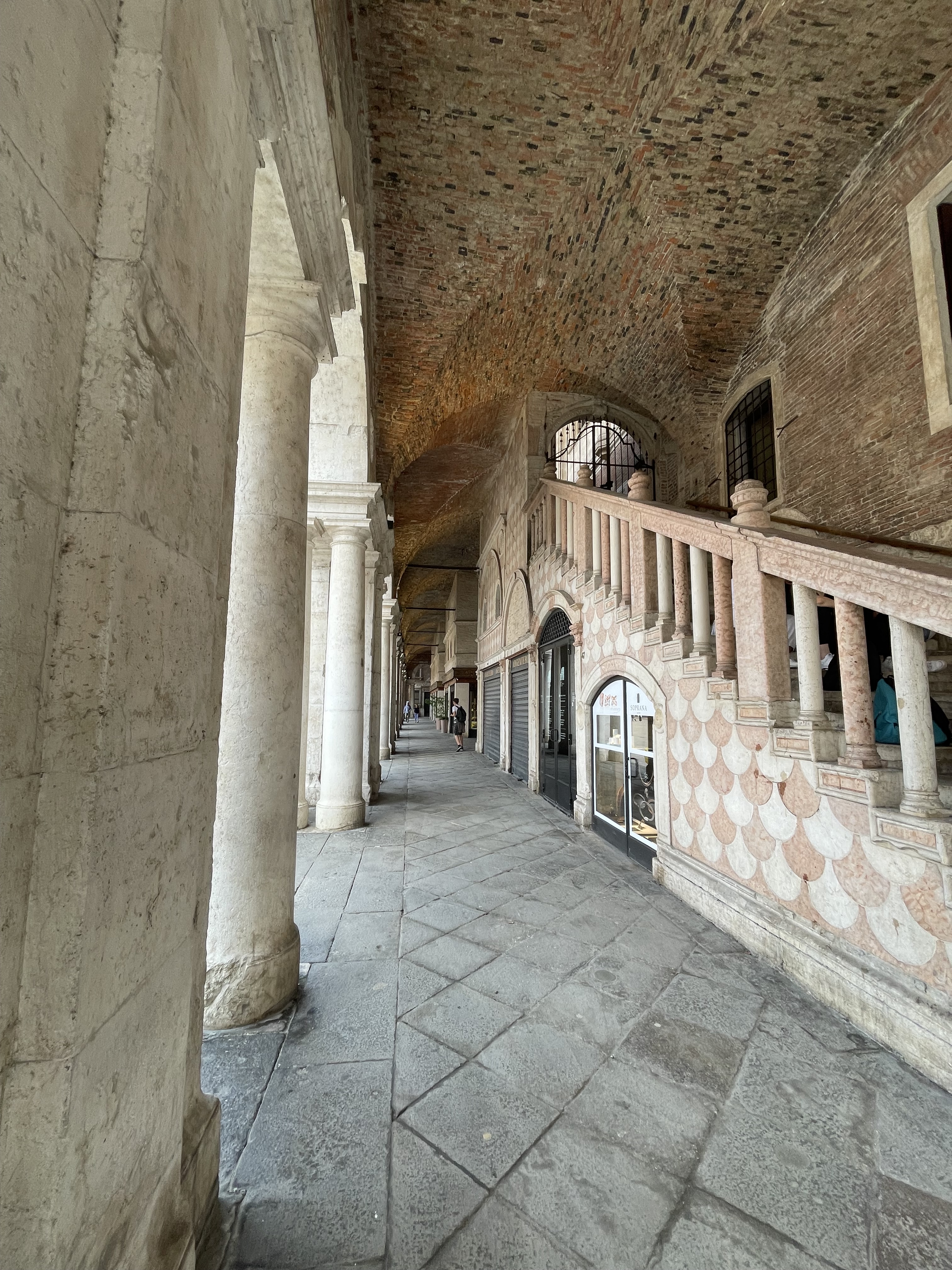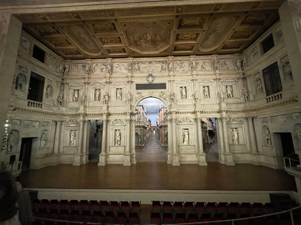 Happily, they had an audio guide that actually downloaded to our phones (almost never works) and we were able to wander the old city of Vicenza discovering some of Palladio’s buildings. We started with the Olympic Theatre built in 1585. The theatre is the same today as when it was built, the stage set a remarkable design with 7 streets (only able to see all 7 if you move about the theatre) which was the city of Thebes since they were putting on Greek plays. It was the first covered theatre ever and the set design was only dismantled once, during WWII, to protect it, putting it in the basement of the basilica.