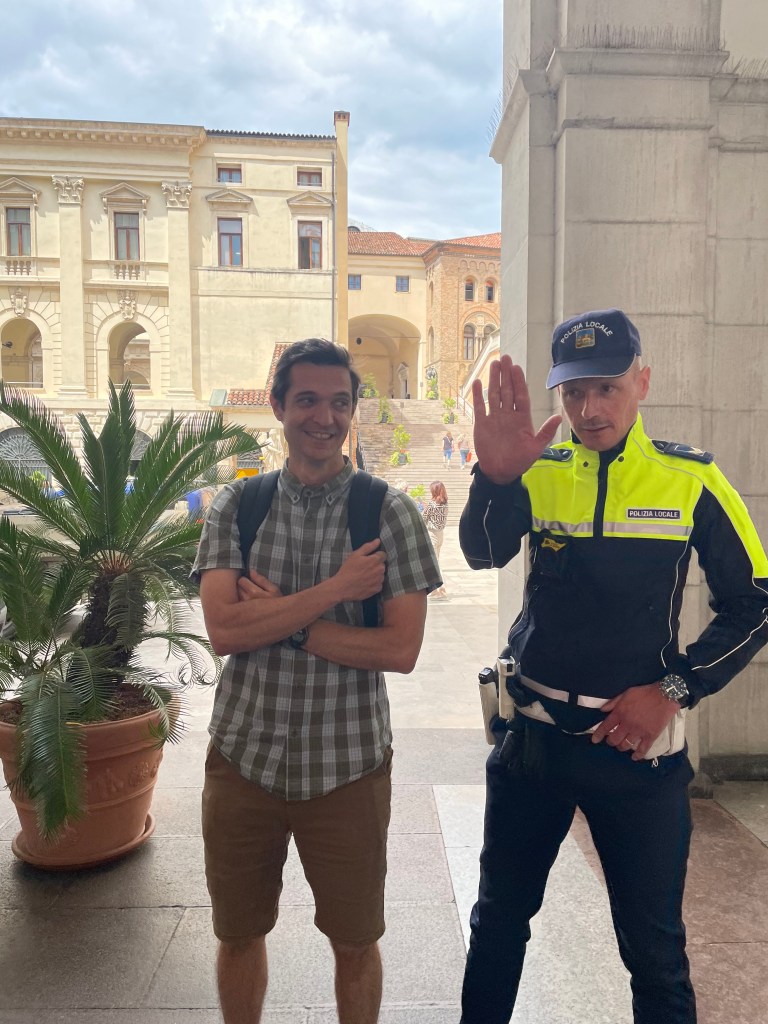 The rest of the drive until we finally found parking way outside the center area was filled with repeating the aaaooouuut directive. When we walked back into the plaza to explore, the first person we saw sitting in the guard booth was the policeman who’d directed us. I waved at him, laughing and he promptly came out to greet us. When we asked if we could get a photo, he immediately joined into the fun of it, telling us to wait while he adjusted his swagger and belt of gear. So fun. Great intro to Padua.