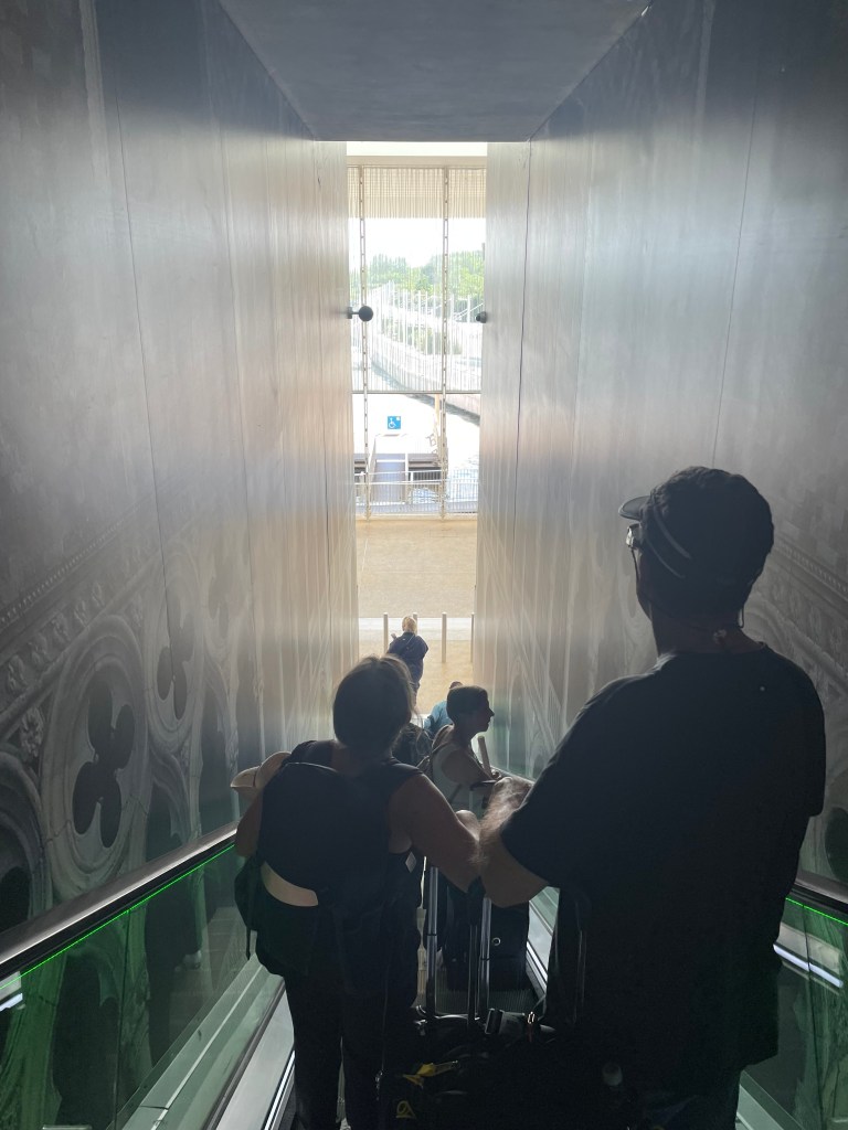 We then drove to the Marco Polo airport to drop our car, with a bit of a sigh of relief, and then walked our things through the airport and suddenly come out on a dock! I knew we were getting a boat taxi, but was still surprised. Sleek elevator and then there’s the water with a dock: