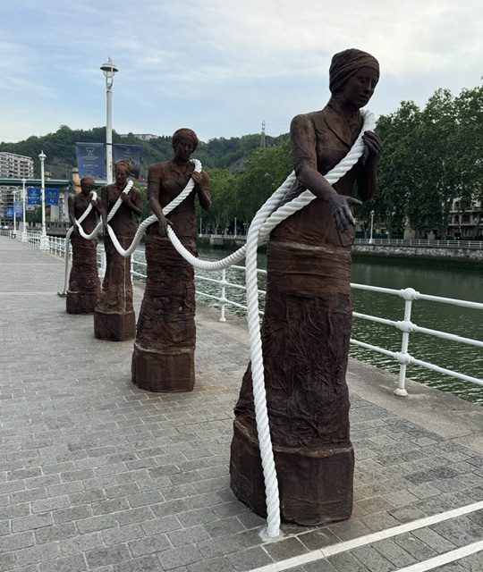 We listened to a recording on our phone talking about the history and the architecture. It was a fun ride and one note of history explained a wonderful statue by Dora Salazar that both Matthew and I had wondered about. Evidently, the boats that came in from the port were pulled up the last part of the river to the head of Bilbao by towing. And the people who often did the towing were widows who had no other way to earn their money and it was a brutal job.