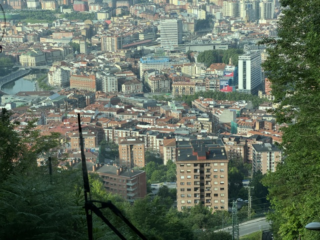 Then I conferred with the front desk guy and a map and started out. There was a funicular within 2 blocks of the hotel that took people up to an entirely different neighborhood at the top of the hill and visitors up to see an incredible view of the city. I was very proud of myself and got in the front car for a full view. It felt way safer than inside the Guggenheim. And it did let me see how big Bilbao is while still contained within the valley. There are about a million inhabitants of the greater area, while central Bilbao is about 350,000.