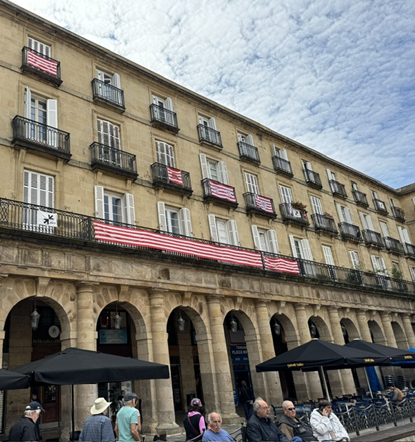 Flags waving from the balconies reflect the fact that the Bilbao football (soccer) won their first big tournament in 40 years. The whole city went crazy and two months later the banners are still waving.