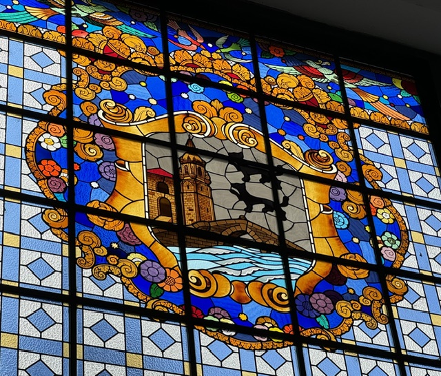 The coat of arms in stained glass at the end of the market showed the consulate building/church, bridge and the wolves reflecting Diego López V de Haro’s name.