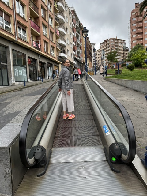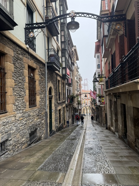 Today, we’re down to Carol, Matthew and me and we walked separately since we started from different points and probably with different plans. I walked the camino following the MacsAdventure map and they walked the river – all the way! I had no idea that was an option because I didn’t explore. I thought I would do my usual when I’m on my own, quiet for 1-2 hours, then listen to dharma and then when tired and needing motivation, go to music or a fun book. It was raining as I started so had all my gear on and my pack covered. I did do the hour and half in quiet, but the entire time was just walking through and out of Bilbao. It was interesting seeing the town, all the kids walking to school with their parents, people going to work, cafes full.