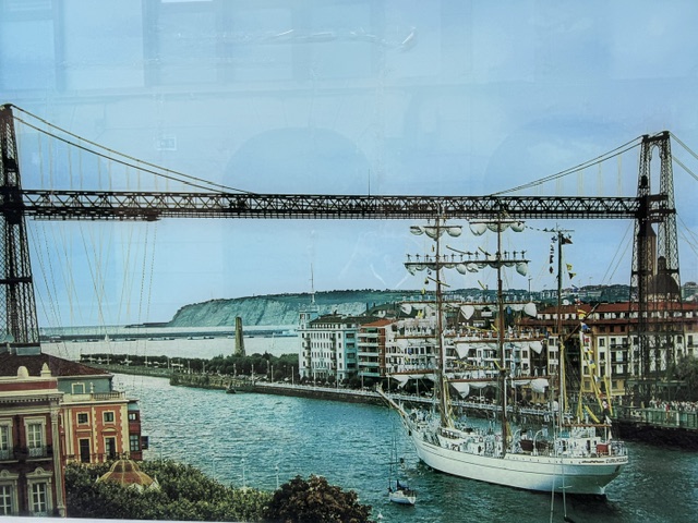 Finally walked into Portugalete and to the best hotel yet, Gran Hotel Puente Colgante. I couldn’t believe it. Right on the river, the weather was clearing up, and Carol came out to greet me to say they’d already sat down to lunch. So a very nice start to our afternoon in the town. Per usual, Tee Travel had booked us into a good hotel with the worst room, but happily, I was able to upgrade so that I could see the river and the famous suspension bridge. And it was only 13 euros! Turns out Carol and Matthew had done the same thing.
