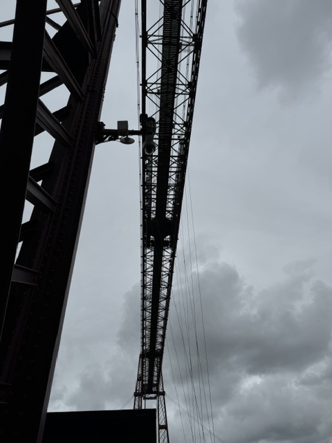 Looks like an interesting bridge, but then you realize that it carries a suspended ferry back and forth, allowing big boats (have seen freighters with tugs going by) to go under while allowing pedestrians and up to 6 cars at a time to cross the river.