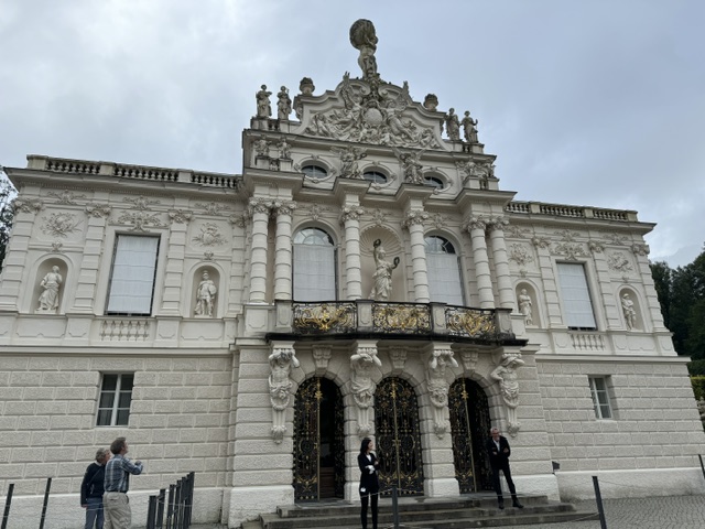 We got to see two of his castles (palaces). The first was his comfort castle, the only one completely finished, and he spent a lot of time there, 2 weeks out of every month. Linderhof Palace was modeled after Versailles since evidently Ludwig II really wanted to be like the sun king, with his position affirmed by the gods. The palace was small, gilt and beautiful, but the real charm and beauty that caught the eye were the incredible grounds. A number of the outbuildings were modeled after scene descriptions from Wagner’s operas, someone that Ludwig adulated and became friends with despite the 40 year age difference. I thought the grotto was incredible – but only saw a short video of it since it’s under serious repair because of water damage. Here’s a description from the Linderhof website: