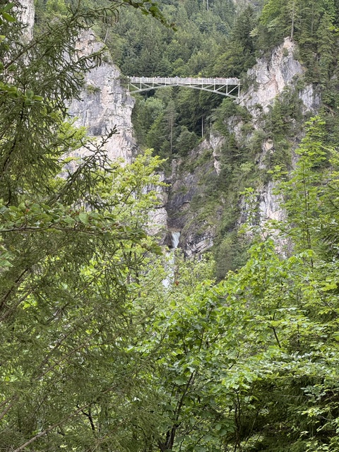 The last one is a bridge that Ludwig’s father built for his mother (though there were two predecessor bridges). Part of managing the whole visitor scene is that everyone goes to the bridge first and sees the scenery all the way down to the lakes with Ludwig II’s father’s castle in front. I got one foot out on the bridge, backed off, Tricia went further, but then some of the wooden planks started moving, so just one shot! We then walked 20 min down to the castle.