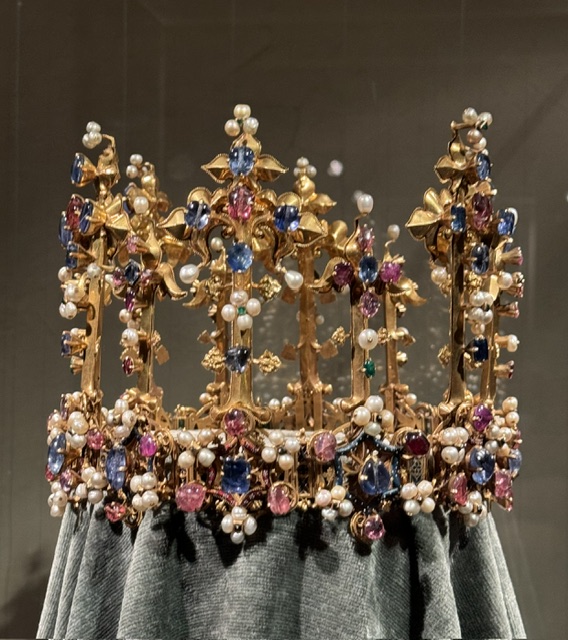 After the Rick Steves tour, I decided to visit the Residenz. Oh my lord, I could not believe how big it was, one section after another. 130 rooms that were on display. What I’d seen was just the front, didn’t realize the gorgeous building I’d seen yesterday was also part of it – couple blocks. I lost track of all the royal branches (all Wittelsbach for 738 years). By the end, even I, history lover that I am, wanted roller skates to get through more quickly. But it was amazing. The treasury was bigger than anything I’ve ever seen. This crown was from 1380:
