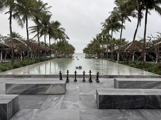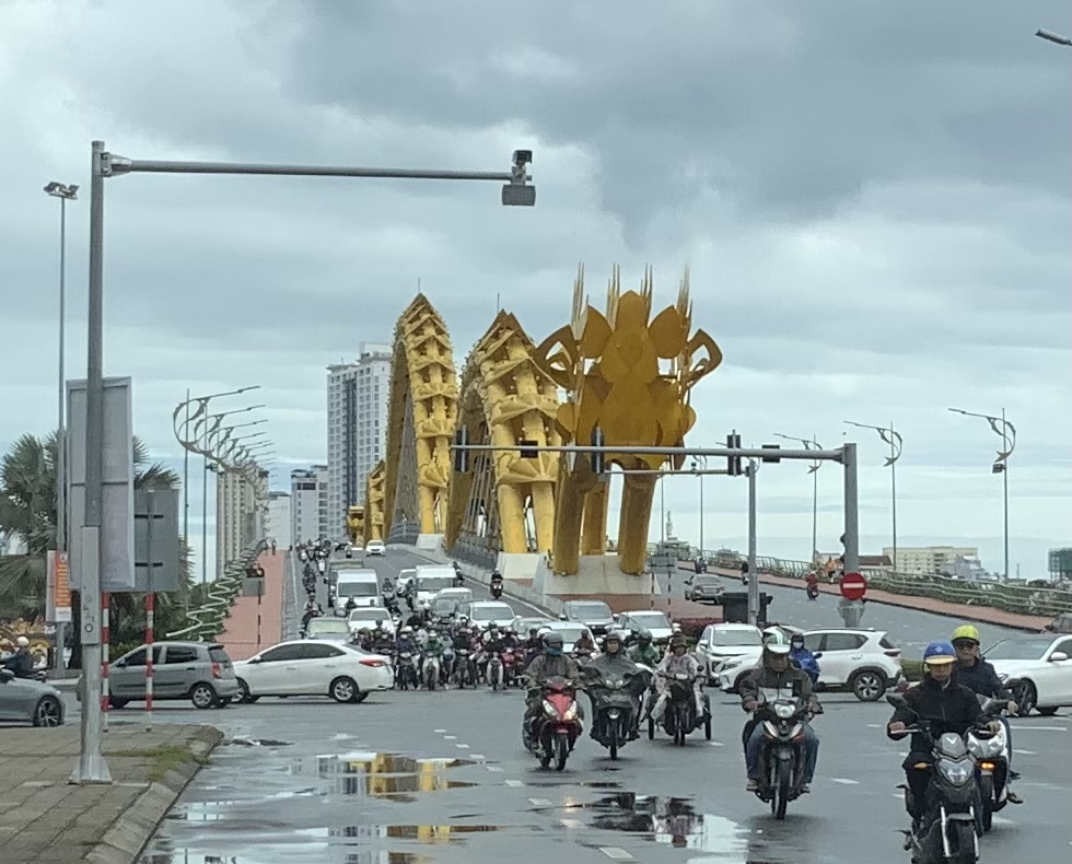 We crossed an amazing dragon bridge in Danang, the head is decorative, but the back is all structural and it’s designed to spew fire and water as part of a show on Saturdays and Sundays. This bridge was built both to welcome, to give a sign of luck and strength and to withstand typhoons. There can be 8 typhoons a year in Danang – from October to December mostly – and it takes a toll, However, in the last 3 years, no typhoons have hit. Instead, because of climate change, now the typhoons are moving to the north. In the last years, they’ve wiped out northern villages because the buildings weren’t designed to withstand the storms.