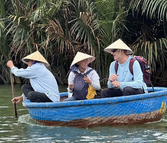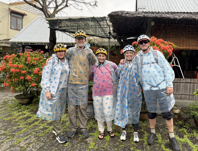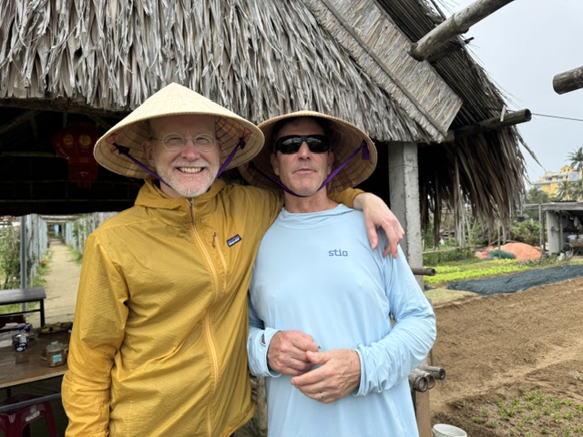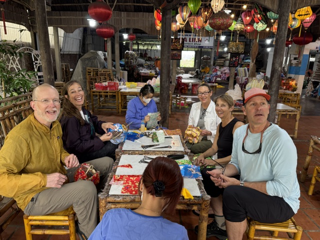 Here we got a wee cooking lesson learning to make a classic Vietnamese pancake with shrimp, pork, and vegetables. All rolled up in rice paper. Turned out that was just the start to the meal – and it was a fun start. We had a variety of dishes; my favorite was morning glory. Later we read that this vegetable, also called water spinach, is the second most common food item after rice. It grows in all climates and soils, the only thing that grows everywhere in the country. It has Vitamins C and B6, iron, calcium and lots of fiber.