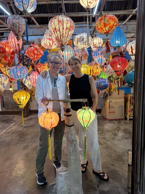 Our first stop was at a lantern making shop and making our own lanterns. Pat and Kellie were ready to put their hands to art, but we quickly learned that the women sitting on either end of our table had very exacting standards and no one met them. Not even Kellie! We’d start something and it would be taken out of our hands and tightened, then taken out of hands for a bit of trimming, then for gluing (Pat – I would have done the gluing!), etc. But by the end, we each had our own little lantern 🙂