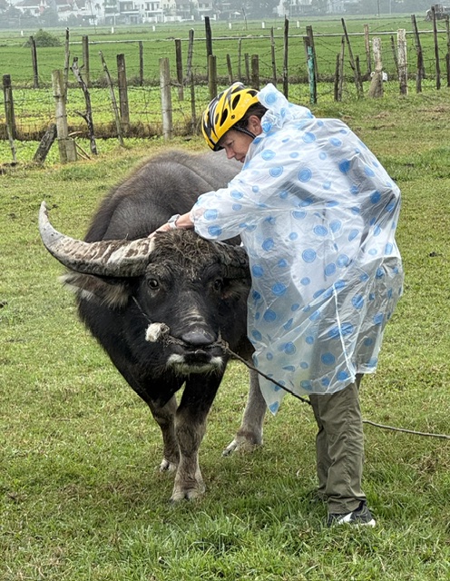 We then got on bikes. Than had prepared for all contingencies. She had water bottles, bags for our bags, rain coat/ponchos and off we went in the drizzle. This was a fun piece of the day because there are paths all around the rice patties and through the backs of the houses in the villages. Kellie’s highlight was stopping and getting to know a water buffalo. This water buffalo’s highlight of his life was having Kellie scratch his ears. I don’t know if I caught his expression, but he really did look like he was in heaven.