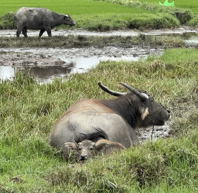 Water buffalo are beloved pets here, incredible docile (except if protecting a baby) and well cared for.
