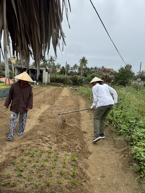 Then we stopped at an organic farm, the only one in the area. This garden was incredible. I tried to get a video for Eli C and Kylie – our farmers – but it was hard to capture. So many different vegetables with different flowers mixed in to keep the insects away. We then got to farm – a wee square. We were startled because the farmer (who clearly had a vast amount of knowledge) was putting cuttings straight into the dirt. We all wondered if she was then going to just pull them up after we left? But I don’t think so. There was another square that some other group had clearly planted and was growing well. They make a fertilizer with a mix of water buffalo dung, and a few other things, super rich looking, so maybe things just grow easily there.