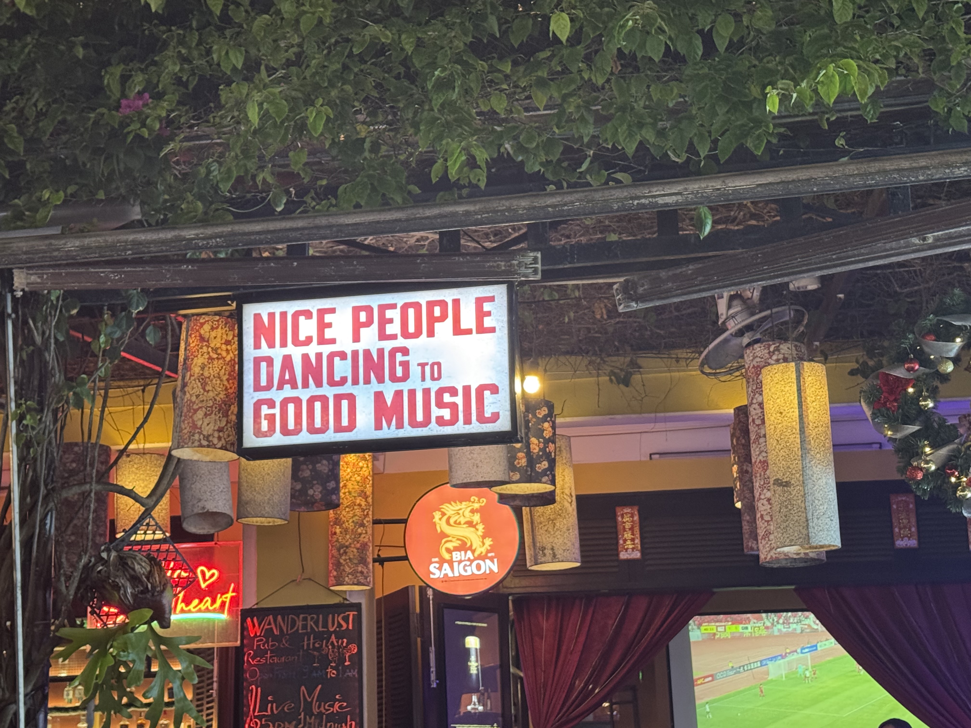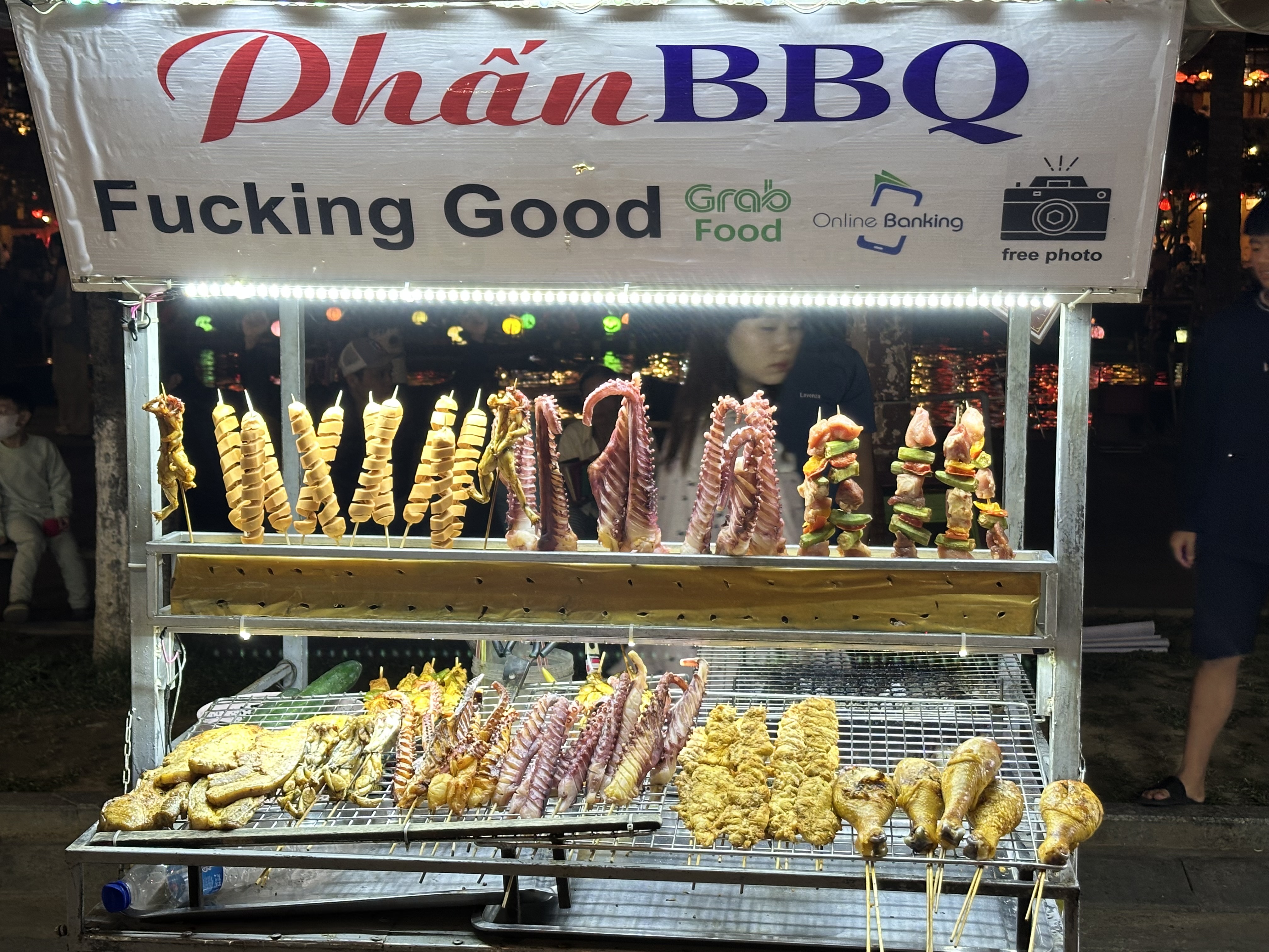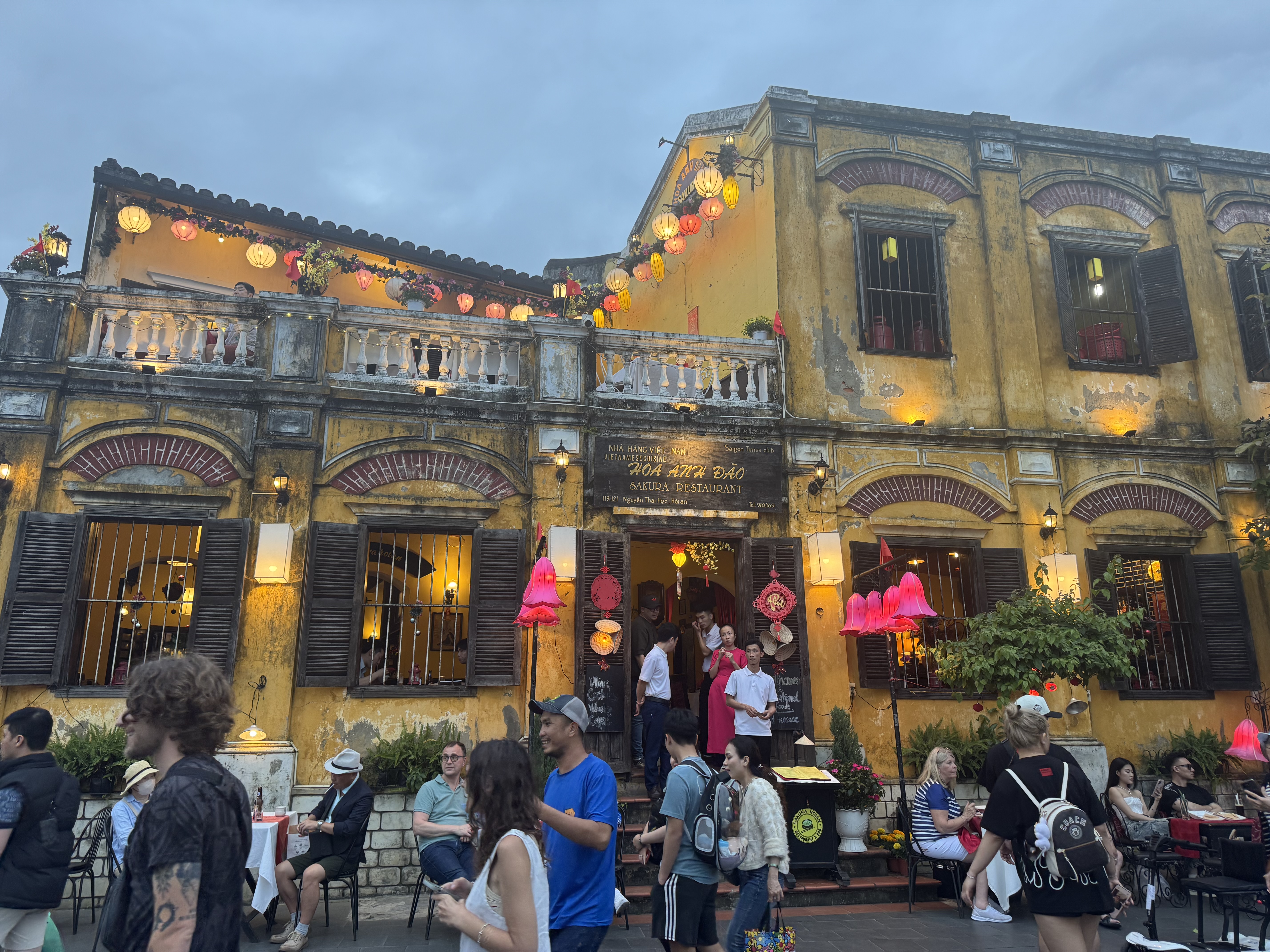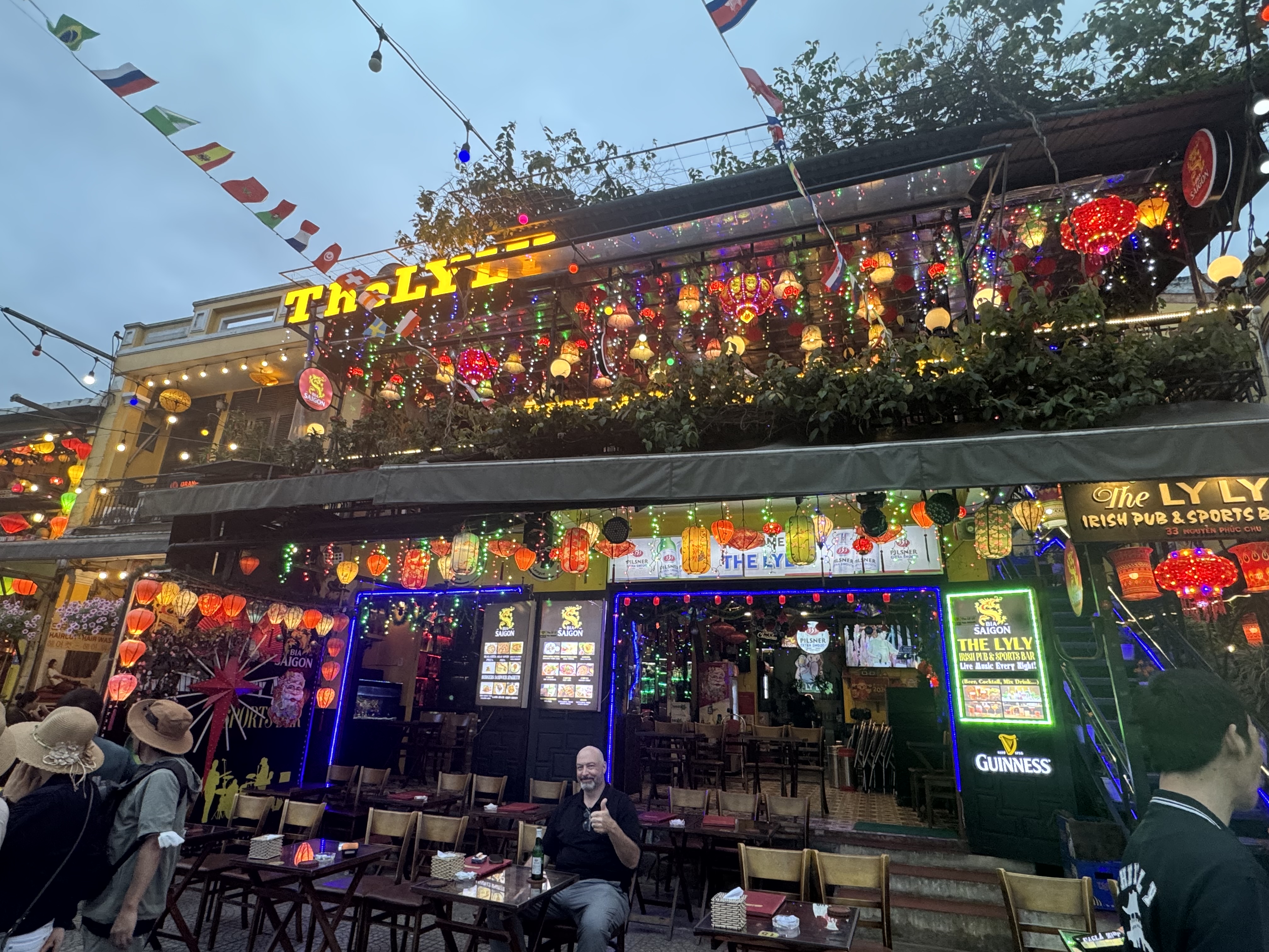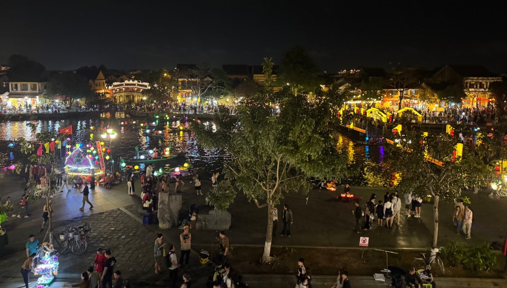 We then walked down the river – lantern river with the night market – to our dinner spot. Our guide from Hue had set this up for us, arguing for a particular table on the highest balcony right up front so we could see all the colors and activity on the river and the banks. It was great. And maybe the best Vietnamese food we’ve had yet.