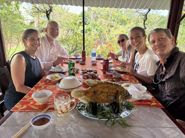 Our guide said they were owned by the government and rented out for free of pennies to those who wanted a vacation, but couldn’t afford one. Bathroom? River. Our fish – where did they come from? Further out in the delta. We think.
