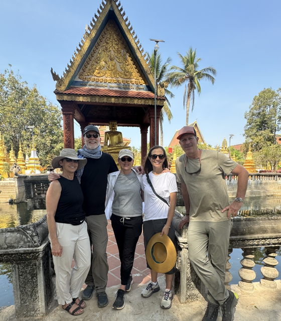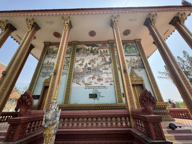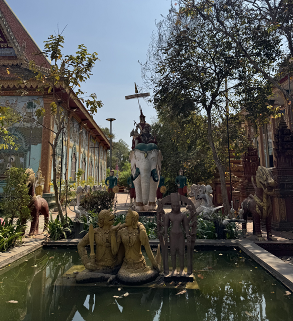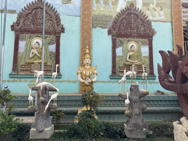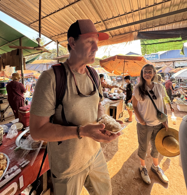 We then went to the actual temple (Wat Por Bonteay Chey area) with stories and traditions painted on the walls, and within were stories from the Buddha’s life. We walked into the temple and saw a technicolor buddha. Huge and mesmerizing with the lights. We gathered around a monk to get a blessing, instructed to sit with our legs going to the side, crossed if we couldn’t manage the side sit. This turned out to be wonderful. The monk recited from memory in Pali, a blessing for health and happiness, continuing for 10 minutes? It was meditative and I slipped into that quiet space quickly. Even when Sam took my phone and started taking photos and videos. I just let it go and listened to the chanting. A surprise gift. And we’d thought of canceling the morning.