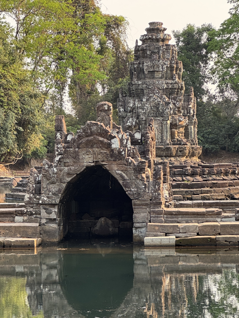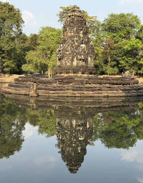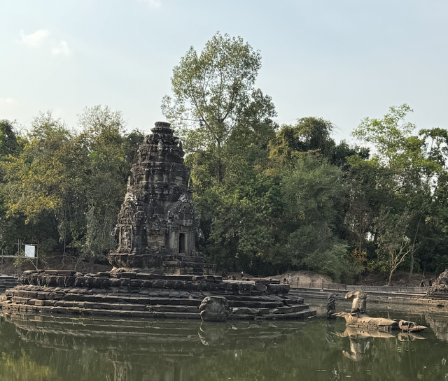 Turns out this was a wonderful little temple designed for medical purposes. It was one of the many hospitals that Jayavarman VII built in the 2nd half of the 12th century. We walked across a long bridge crossing a Barray – or a rain water collecting reservoir – to get to this small temple. The Neak Pean ,“the entwined serpents,” had two giants carved snakes which wrapped the center island temple in the small lake, we could just see the remnants. This was a Buddhist temple built within its own small reservoir on the island out on the lake. The center temple was surrounded by water at a slightly higher level than the 4 small surroundings blessing pavilions with their own pools at east, west, north and south points. A person could be blessed or healed by going into the small pavilions and water would pour over them from the upper lake. This was also built by King Jayavarman VII in the 12th century. I’m so glad Scott asked to see it.